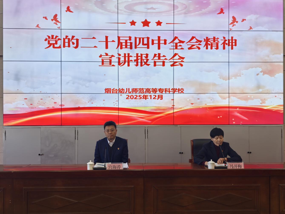 12月11日下午,市委宣讲团成员、学校党委书记宫海涛在学术报告厅宣讲党的二十届四中全会精神。会议由党委副书记、校长冯开梅主持,领导班子成员、全体教职工及部分学生代表齐聚一堂,共同聆听这场思想的盛宴。