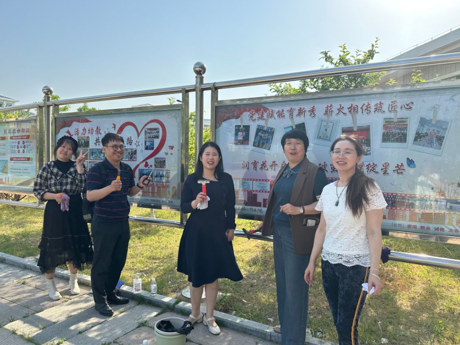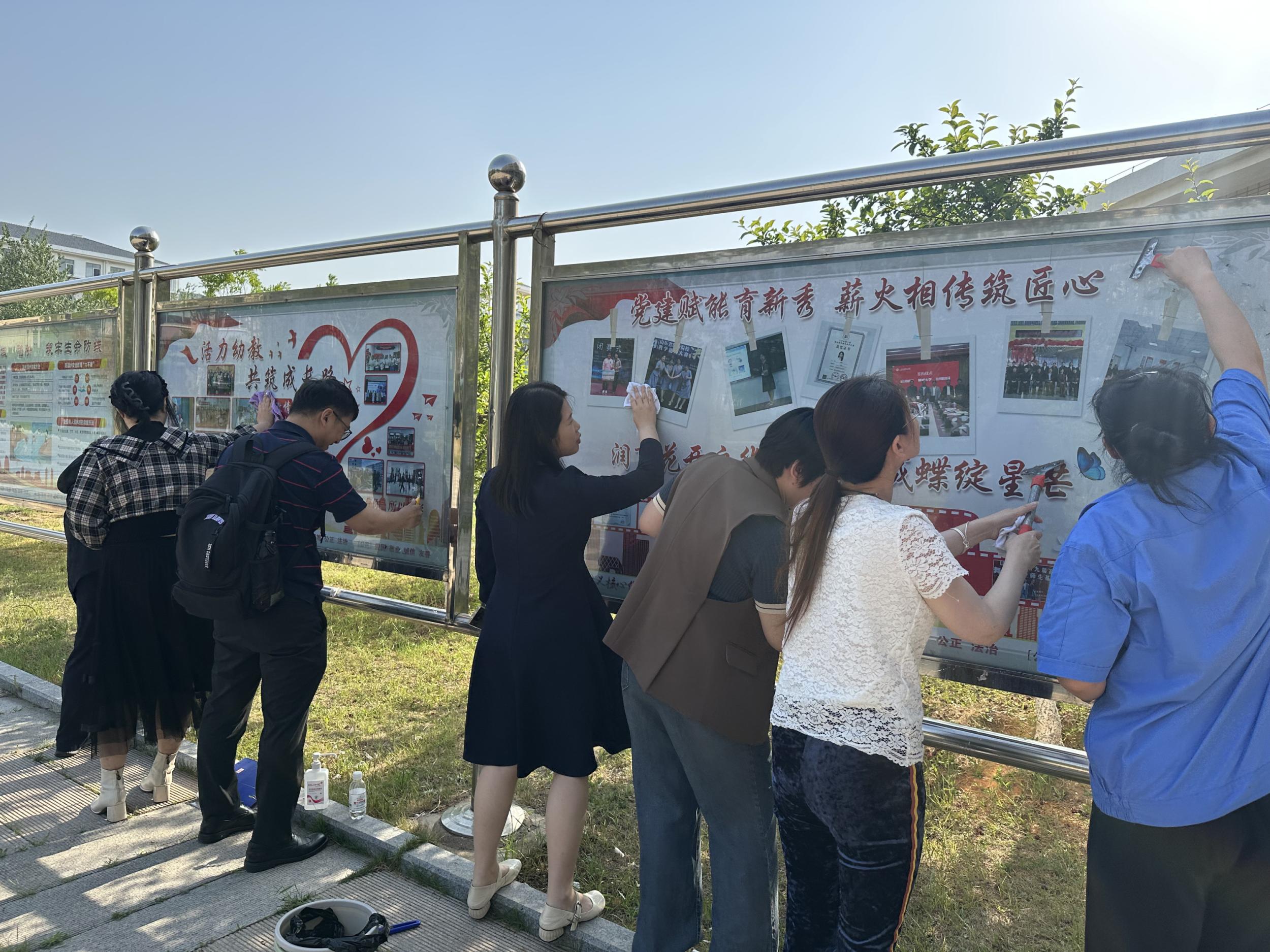 大家各自取出工具,便埋头行动起来。有的同志用壁纸刀尖小心探入纸页缝隙,谨慎剥离着那些顽固的旧痕;有的同志自制“矿泉水瓶喷壶”,水痕蜿蜒处,灰尘便纷纷退让;有的同志则将抹布蘸湿后用力擦拭,玻璃逐渐显现出清亮的面目。擦亮的玻璃上跳跃出同志们俯身忙碌的身影。大家相互配合,分工协作,一个人扶住宣传栏边框,另一个人则仔细刮除角落的残胶。