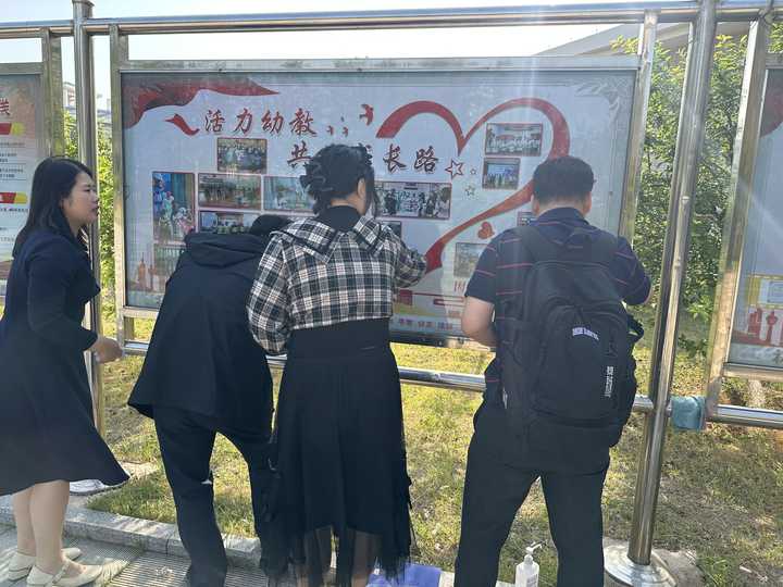 2025年5月26日课外,教学B楼南门外,支部的党员们已聚集在两块宣传栏前。宣传栏玻璃上层层叠叠的旧通知、胶带如枯叶般卷翘着边角,党员们今天要进行志愿服务活动——清理宣传栏。