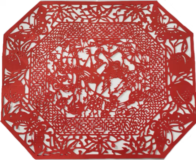 作品简介:作为剪纸,象征在鹤的吉祥如意,以祝福长寿为任,四周以寿桃环绕,加之藤条的陪伴,寓意福寿连绵,心想事成,蝴蝶的陪衬,为剪纸图样增添更多风采和韵味,新年贴窗,新的一年,红红火火,群蝶飞舞,好事将近。