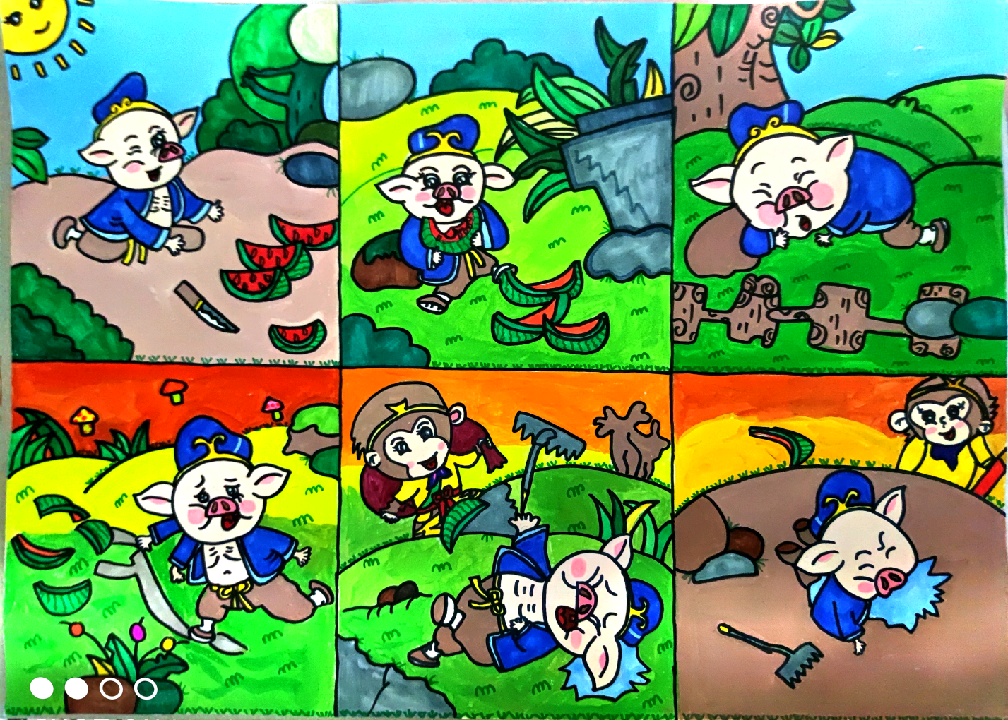 作品简介:该作品是西游记中的一个片段,猪八戒和孙悟空去找食物,猪八戒看到西瓜没忍住,自己偷偷的吃完了,后来被孙悟空教训了,自己收到了惩罚,告诫幼儿要懂得分享,自食其力。