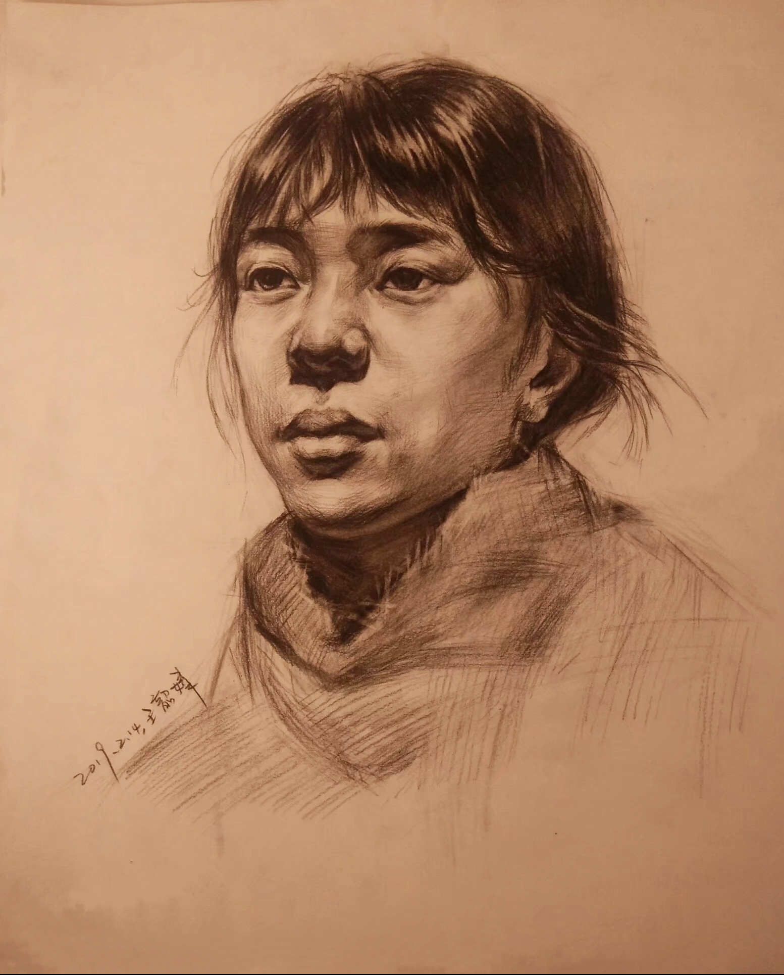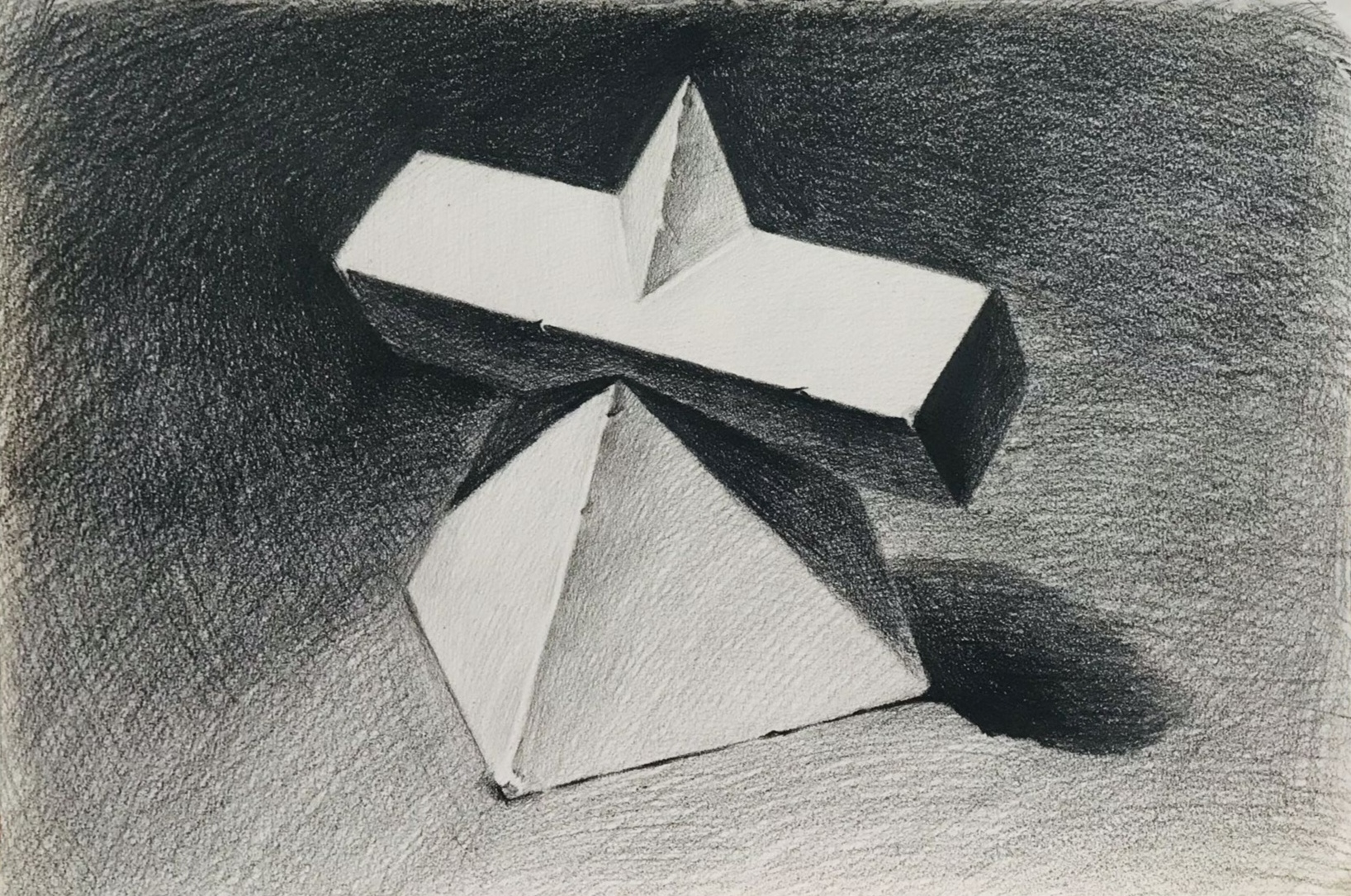 作品简介:石膏几何体临摹画, 四棱锥棱柱组合体素描画。