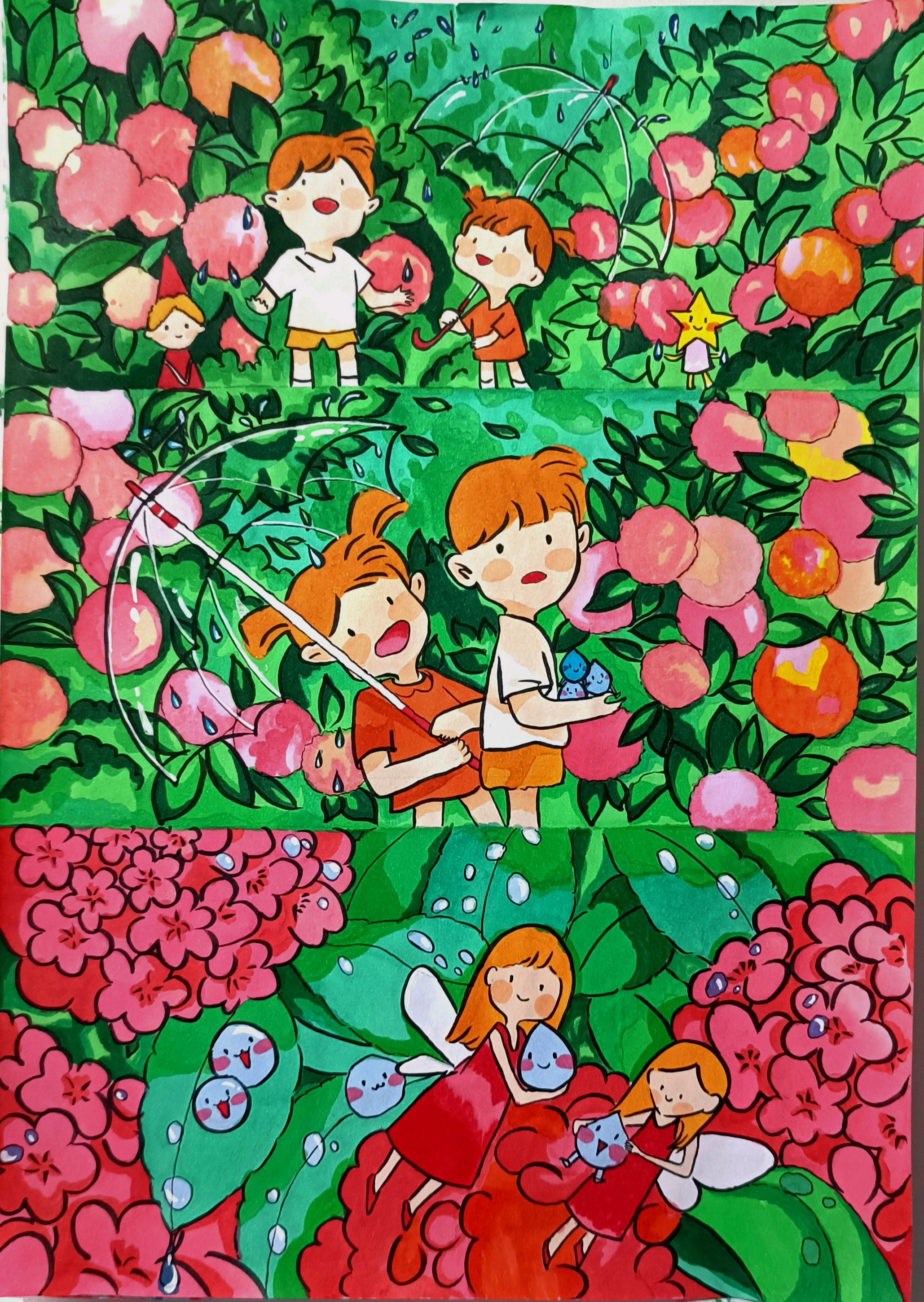 作品简介:作品的颜色鲜艳,用拟人化呈现出人与自然和谐相处的美好景象,给人以治愈的感觉。在第一个画面中,小朋友们很开心的在感受雨。第二个画面中,小朋友们和小雨滴已经成了好朋友,三个小雨滴还在男孩的手中玩耍。最后一个画面中,是花间的小精灵像对小朋友一样陪着小雨滴,小雨滴都十分开心。