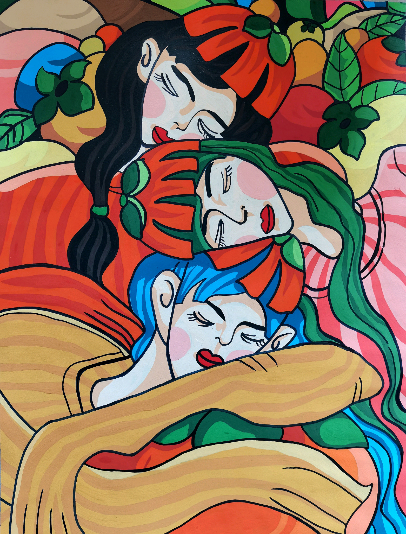 作品简介:秋天到了,硕果累累,三个姑娘将成熟的蔬菜水果都收获了,甚至还将她们最喜欢的柿子做成了帽子戴在头上,兴许是太累了,三个姑娘带着浅浅的微笑安然睡了过去。
