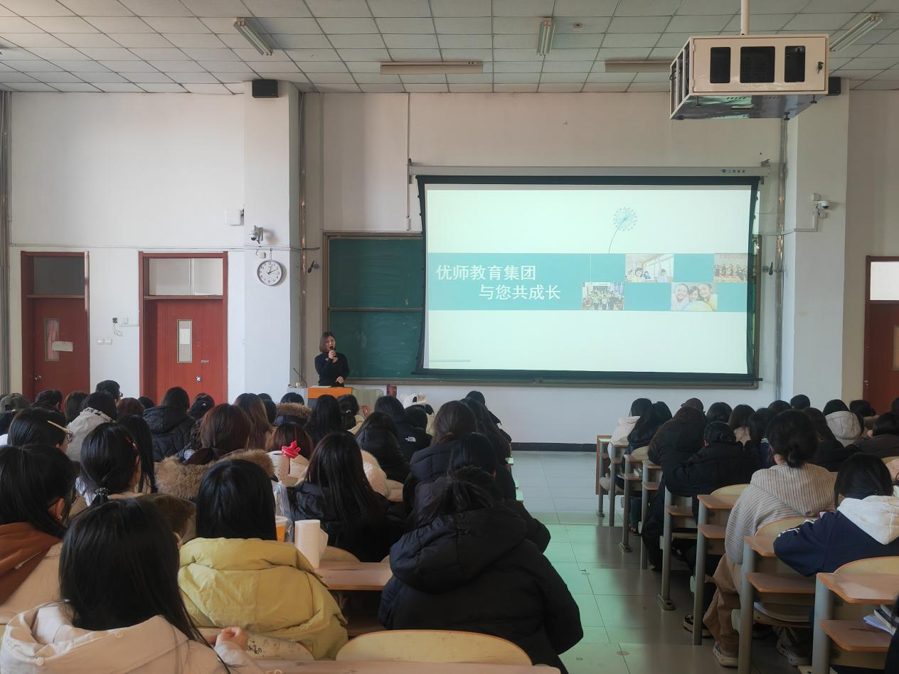 宣讲会现场气氛热烈,座无虚席。山东省优师教育科技集团的李老师从当前幼教行业的广阔前景与人才需求切入,详细介绍了冠名班的合作模式、特色课程、实践资源以及未来的就业保障,为学生们勾勒出清晰的职业发展蓝图。