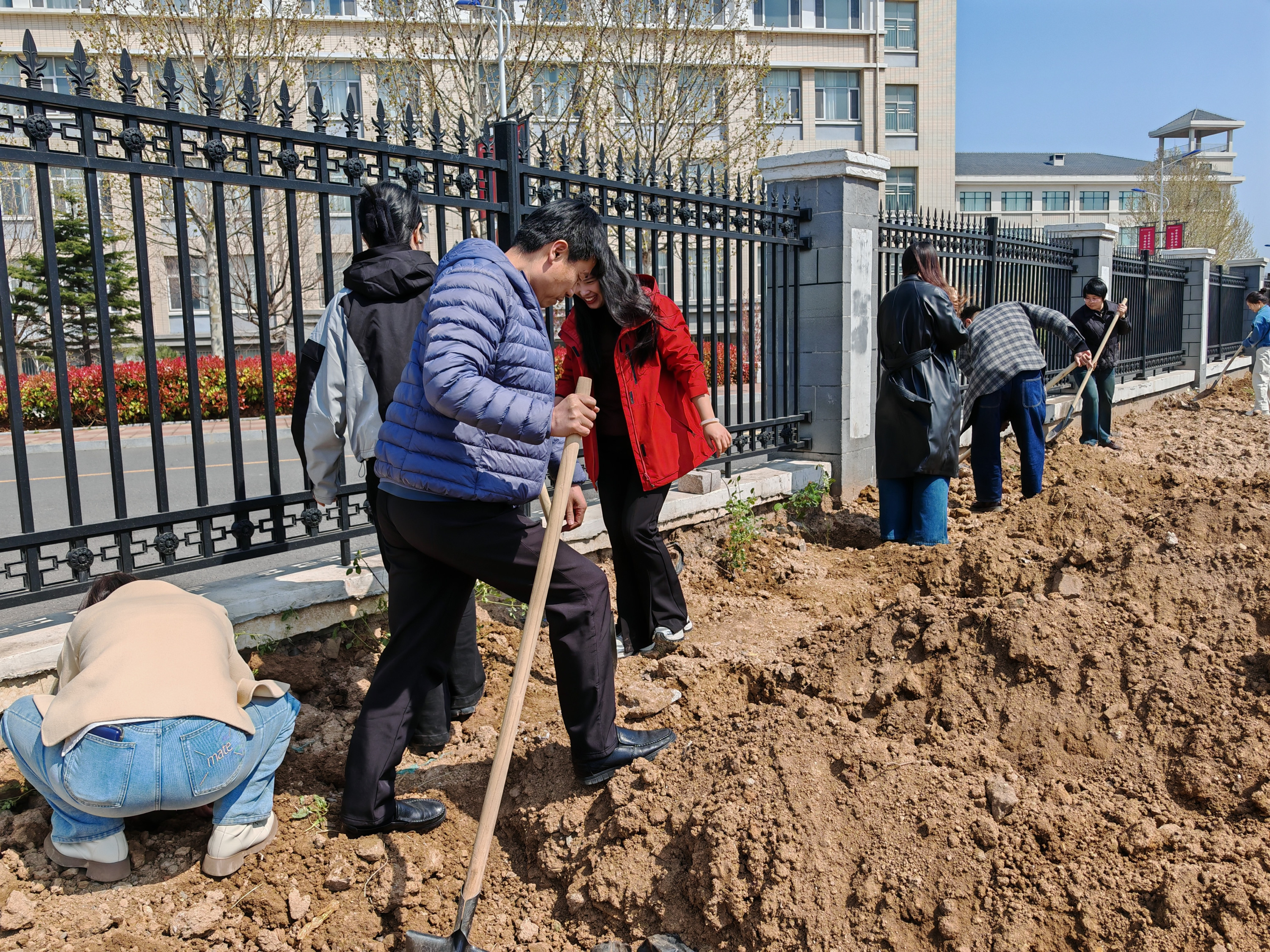 大家齐心协力,干劲十足,现场有人挥锹铲土、有人扶苗填坑、还有人培土浇水,一片欢声笑语,热火朝天的劳动景象,形成一道亮丽的风景线。五十株蔷薇在大家的配合下倚上围墙,只待来年悄悄爬上栏杆,为校园如火绽放。