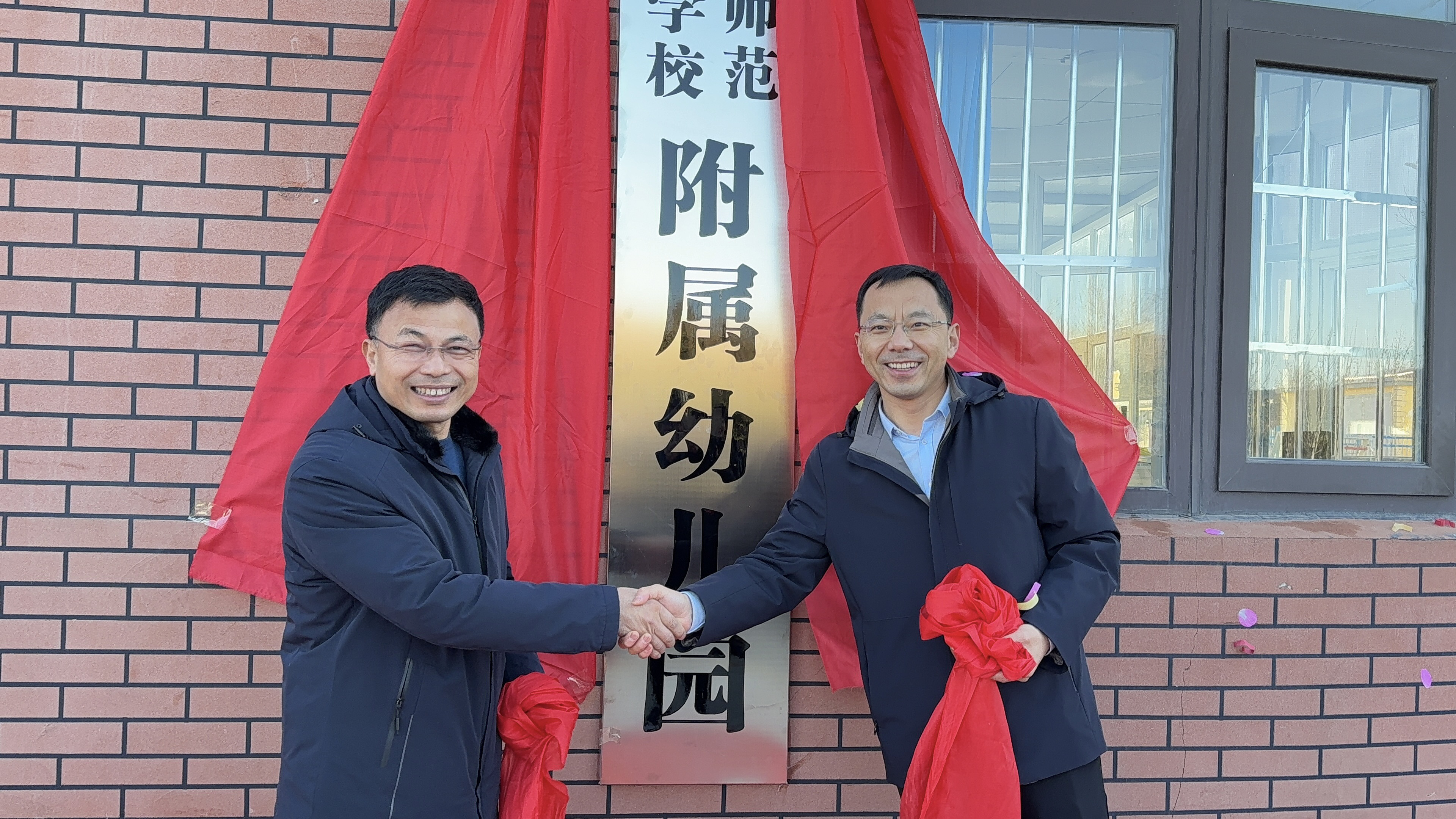 在与会领导和教师代表的共同见证下,曲健和吴朋飞共同为实验幼儿园挂上了“烟台幼儿师范高等专科学校附属幼儿园”的牌子。