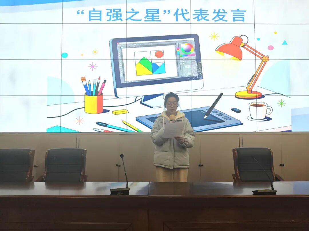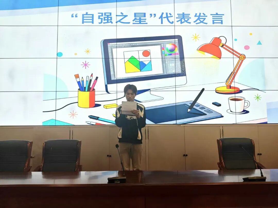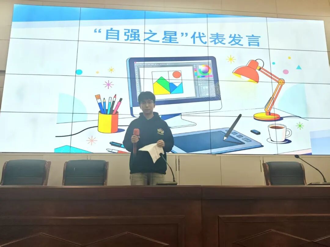 “自强之星”代表刘宪佳、吕怡静、杜宜哲三位同学依次登台分享心路历程。刘宪佳细数着从初入岗位时的手忙脚乱,到独当一面后的从容笃定,那些在整理资料时的细致、协助活动时的忙碌、解答同学疑问时的耐心,都化作了成长路上最珍贵的印记;吕怡静谈及团队协作的温暖,回忆着与伙伴们并肩攻克难题的点滴,感慨勤工助学让她学会了倾听与包容,也收获了珍贵的同窗情谊;杜宜哲则分享了如何平衡学业与工作,用高效的时间管理在岗位历练与专业学习中双向收获,让青春在奋斗中绽放光彩。他们的分享真挚而朴实,为新一届成员勾勒出清晰的工作蓝图,也让大家懂得,平凡的岗位里藏着无限的成长可能,只要心怀热爱、坚守责任,就能收获属于自己的精彩。