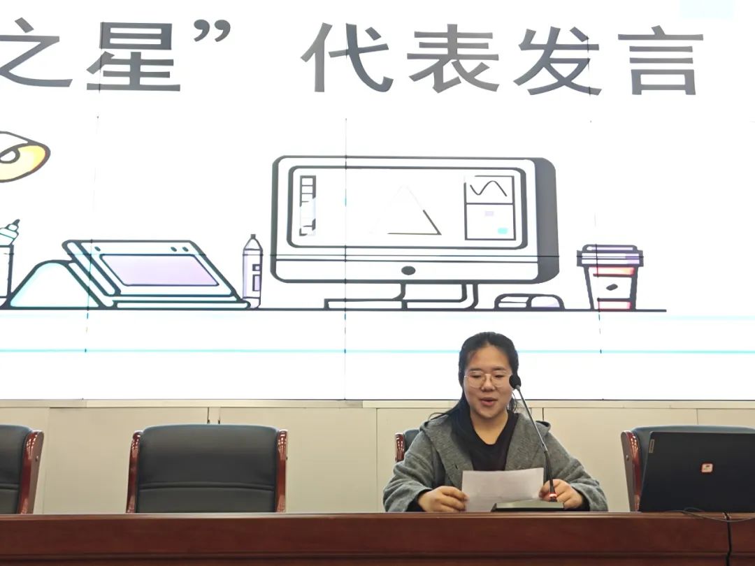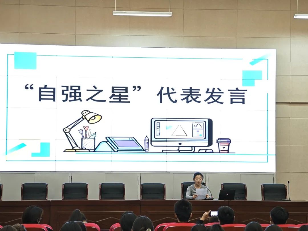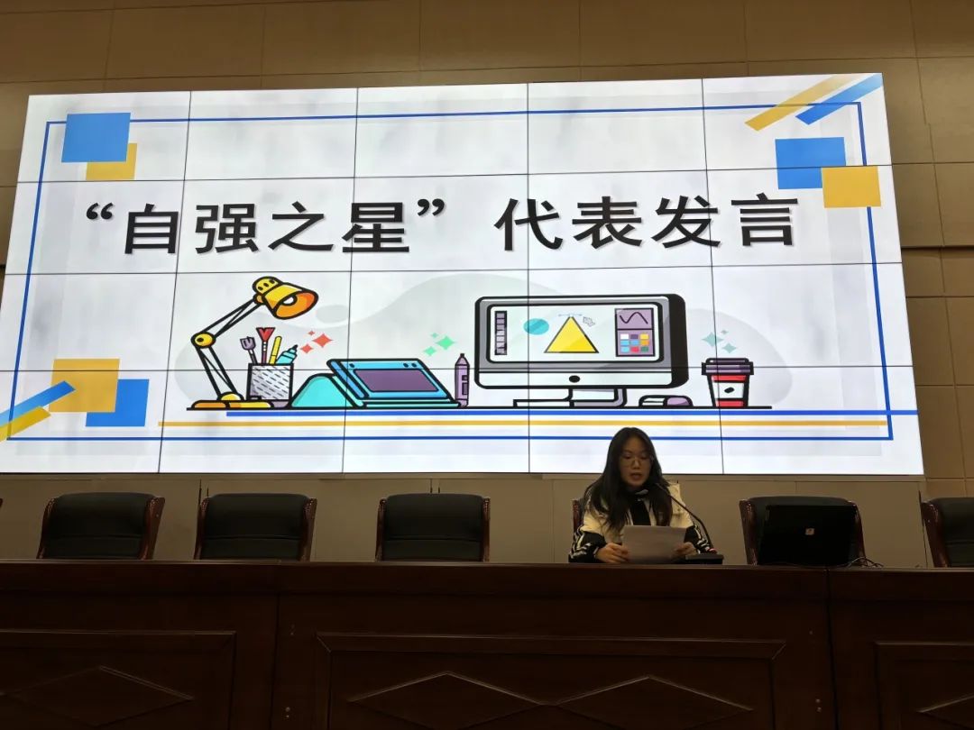 随后,主持人刘洋宣读了新一届勤工助学自强之星成员名单,由孔晓慧老师为他们颁奖。接下来由邱欣宇、苗雅文、魏甜甜等自强之星代表依次发言,他们在发言中表达了对学校的感激之情,勤工助学让他们学到了很多在课堂上学不到的知识,同时,每月的工酬也帮他们缓解了生活的压力。接着,她们说道“在勤工助学的过程中,我收获的远不止是物质上的帮助。那些在岗位上度过的时光,教会了我责任与担当。”“勤工助学恰似一束光穿透阴霾,成为我人生道路上不可或缺的坚实依靠”……她们也表示,将继续秉持“自立自强,互助奉献”的宗旨,进一步优化自身优势积极拓展自己的个人能力,更好的做好自己的本职工作,为学校的建设与发展贡献更多力量。展望未来,新一届勤工助学团队已整装待发,他们将承前启后,在助力同学们成长成才的道路上稳步迈进,在校园中传递自立自强的精神火炬。