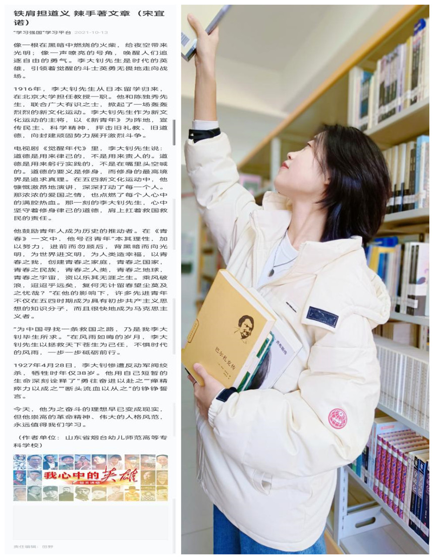 近日,学前教育二系19专8班宋宜诺同学的征文《铁肩担道义 辣手著文章》荣登中宣部“学习强国”全国学习平台。文章描绘了在风雨如晦的艰难岁月里,时代的英雄李大钊是如何“心中坚守着修身律己的道德,肩上扛着救国救民的责任”,带领觉醒的斗士们为中国寻找一条救国之路的。字里行间激荡着对革命先辈的敬仰和缅怀、对伟大祖国的热爱和祝福以及对青年学子时代使命的勇敢担当。