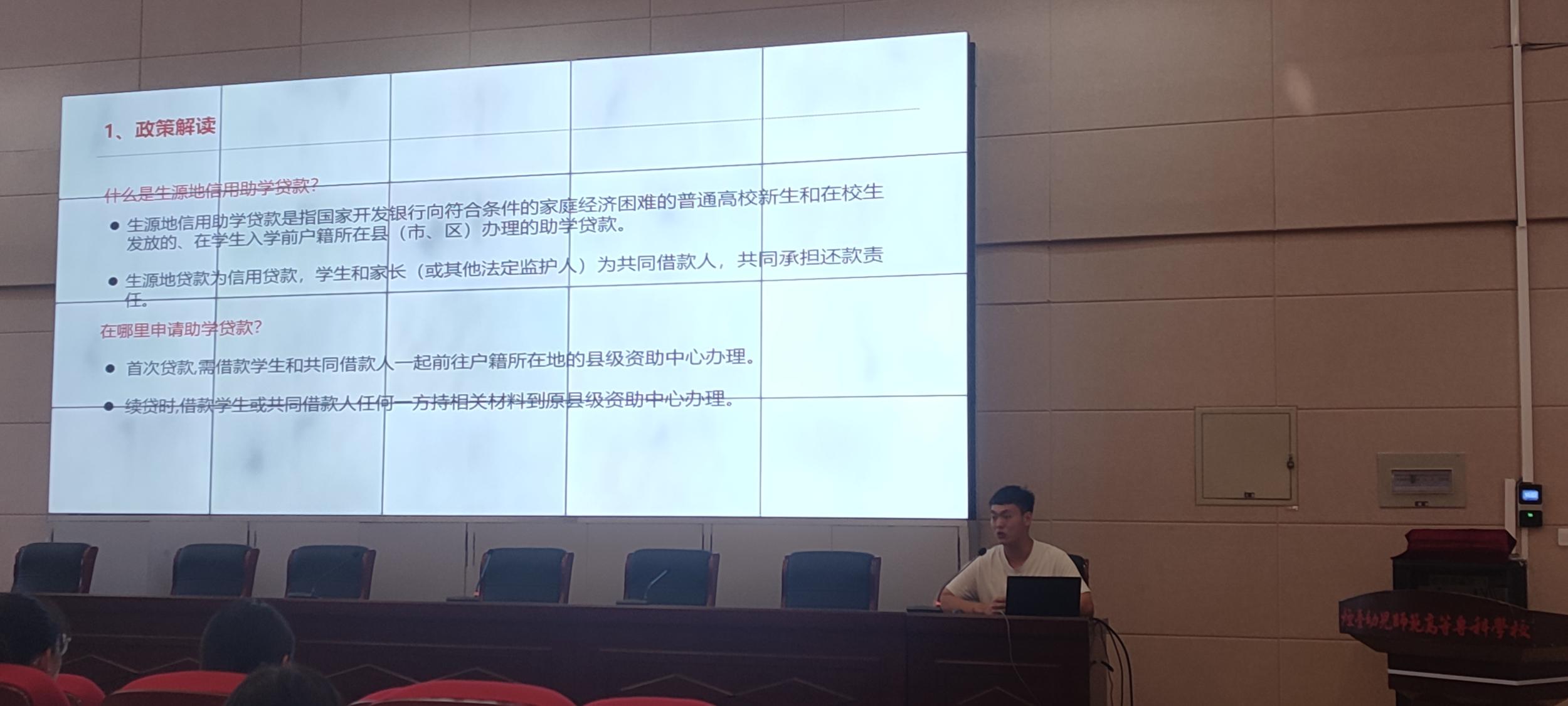 首先,孔晓慧同志向学生讲解本次会议的目的——向学生宣传生源地贷款及其注意事项,加强学生的诚信意识。生源地贷款是提供给经济困难学生的专项资助政策,旨在缓解学生的学费、生活压力,帮助他们更好地完成学业。“不让一个学生因家庭经济困难而失学”,是党、政府及学校长期以来的承诺与奋斗目标。通过助学贷款的资助,一批批学子得以顺利完成学业,开启新的人生旅程。