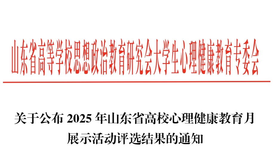 近日,山东省高校思想政治教育研究会大学生心理健康教育专业委员会发布《关于公布2025年山东省高校心理健康教育月展示活动评选结果的通知》,我校推送作品获评心理健康教育特色活动三等奖1项,心理健康教育主题班会二等奖1项,“身边的故事”暖心摄影作品三等奖1项。