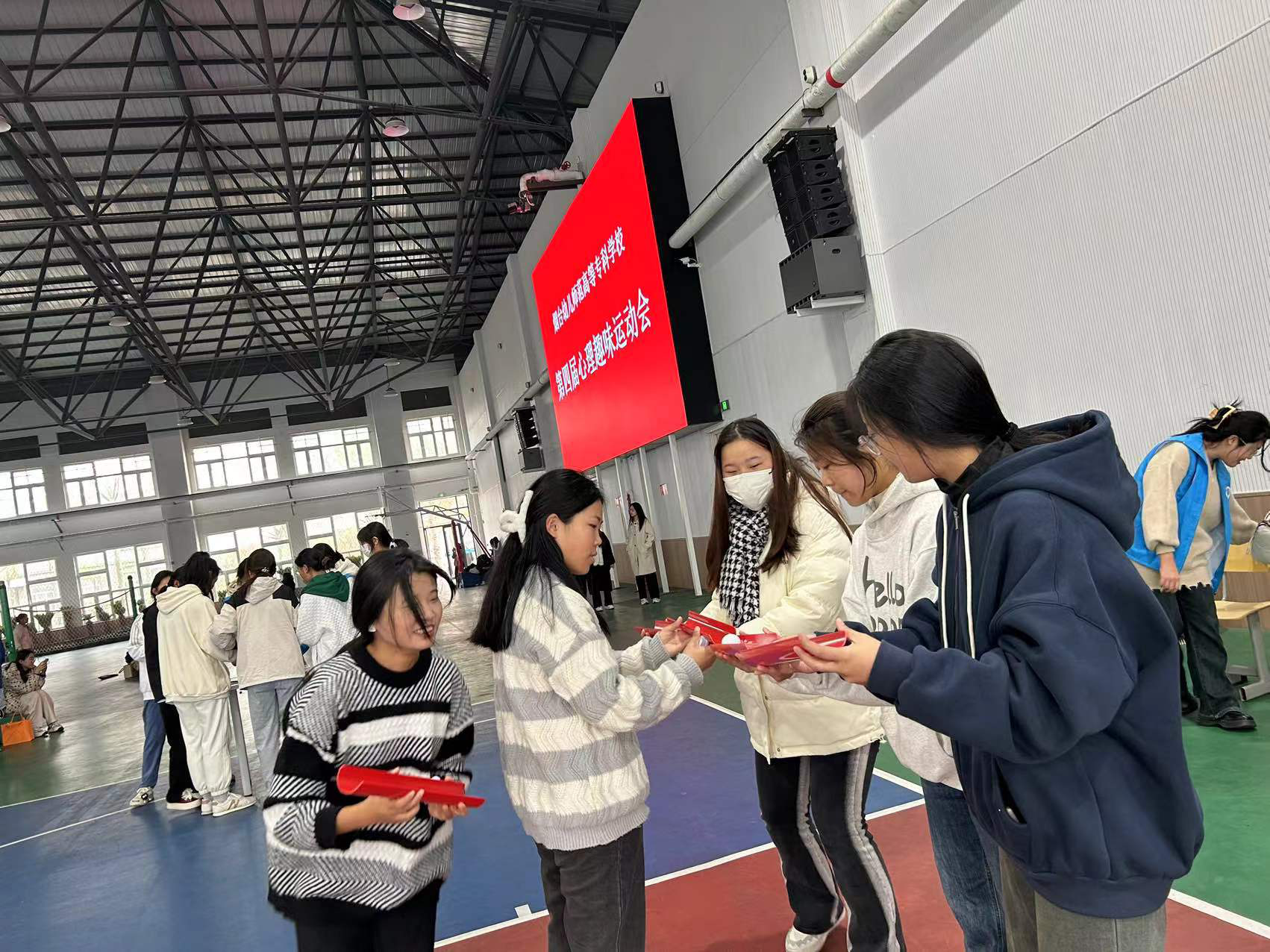 体育馆内,学生们充分发挥合作精神和竞技精神,积极参与,互相协助,现场气氛热烈,大家的热情感染了每一个人。