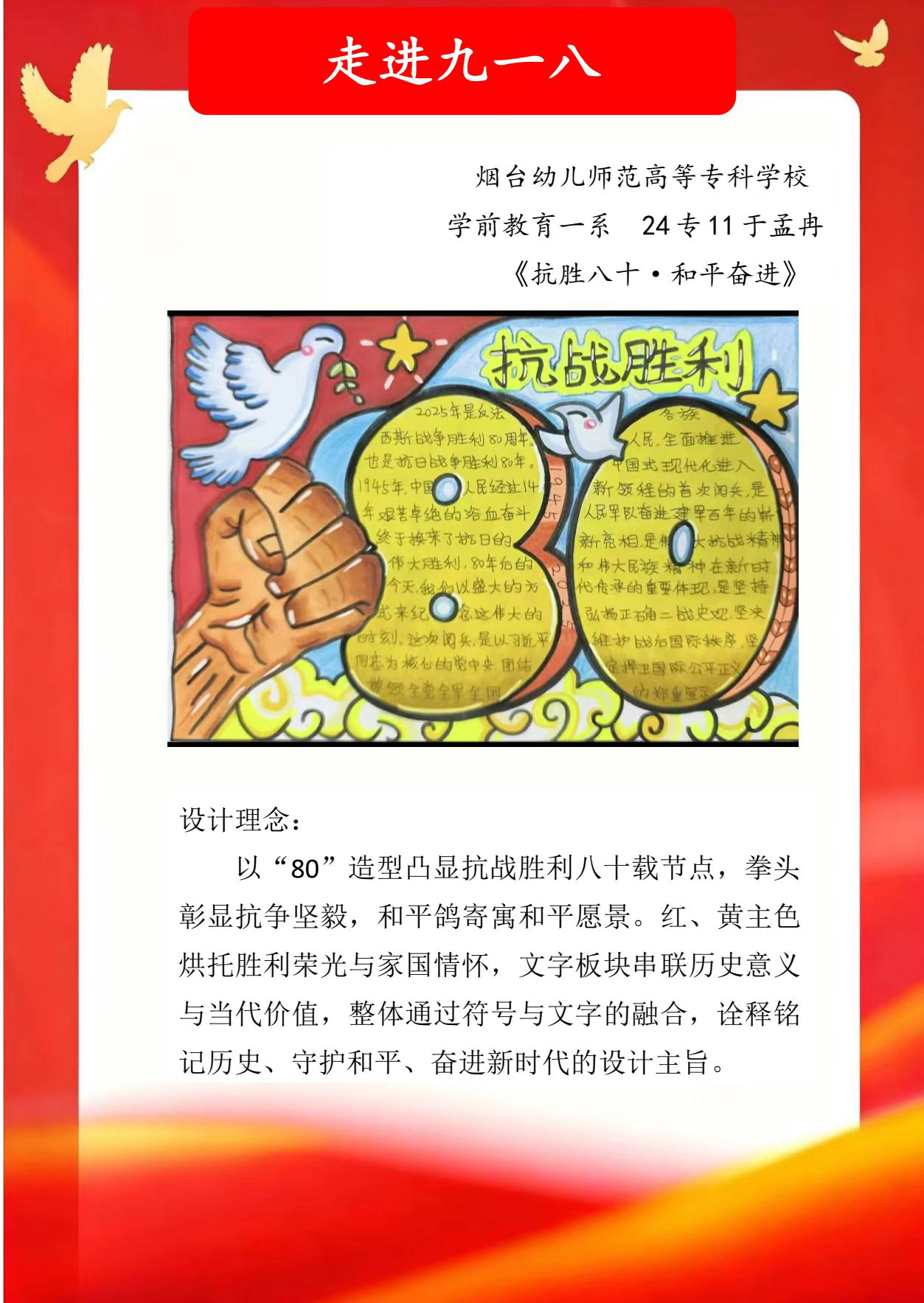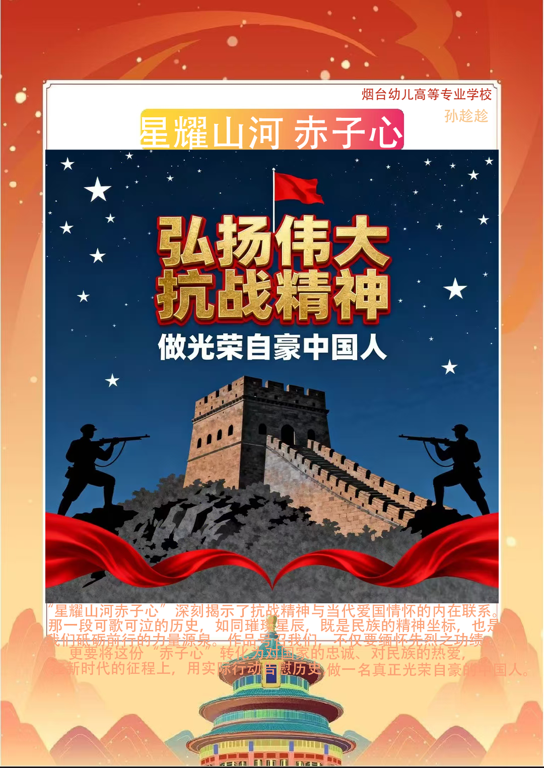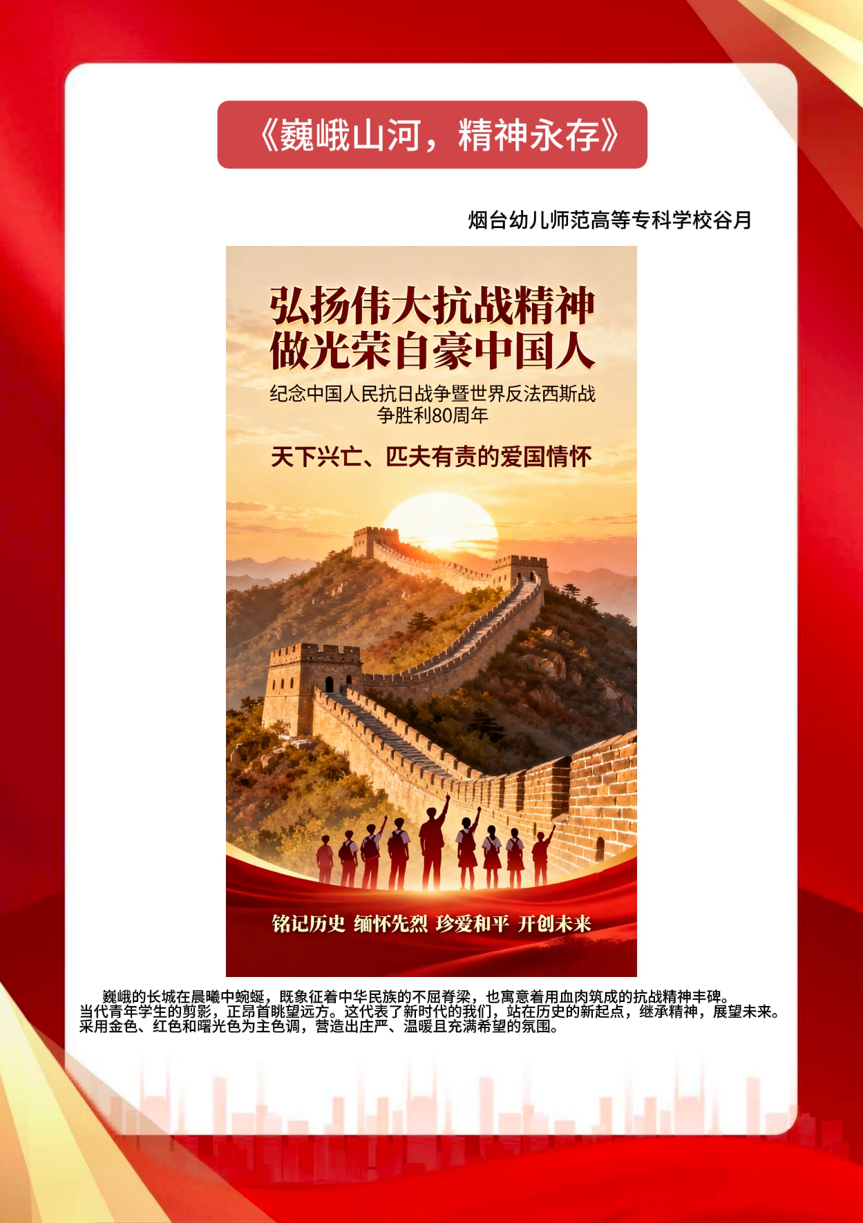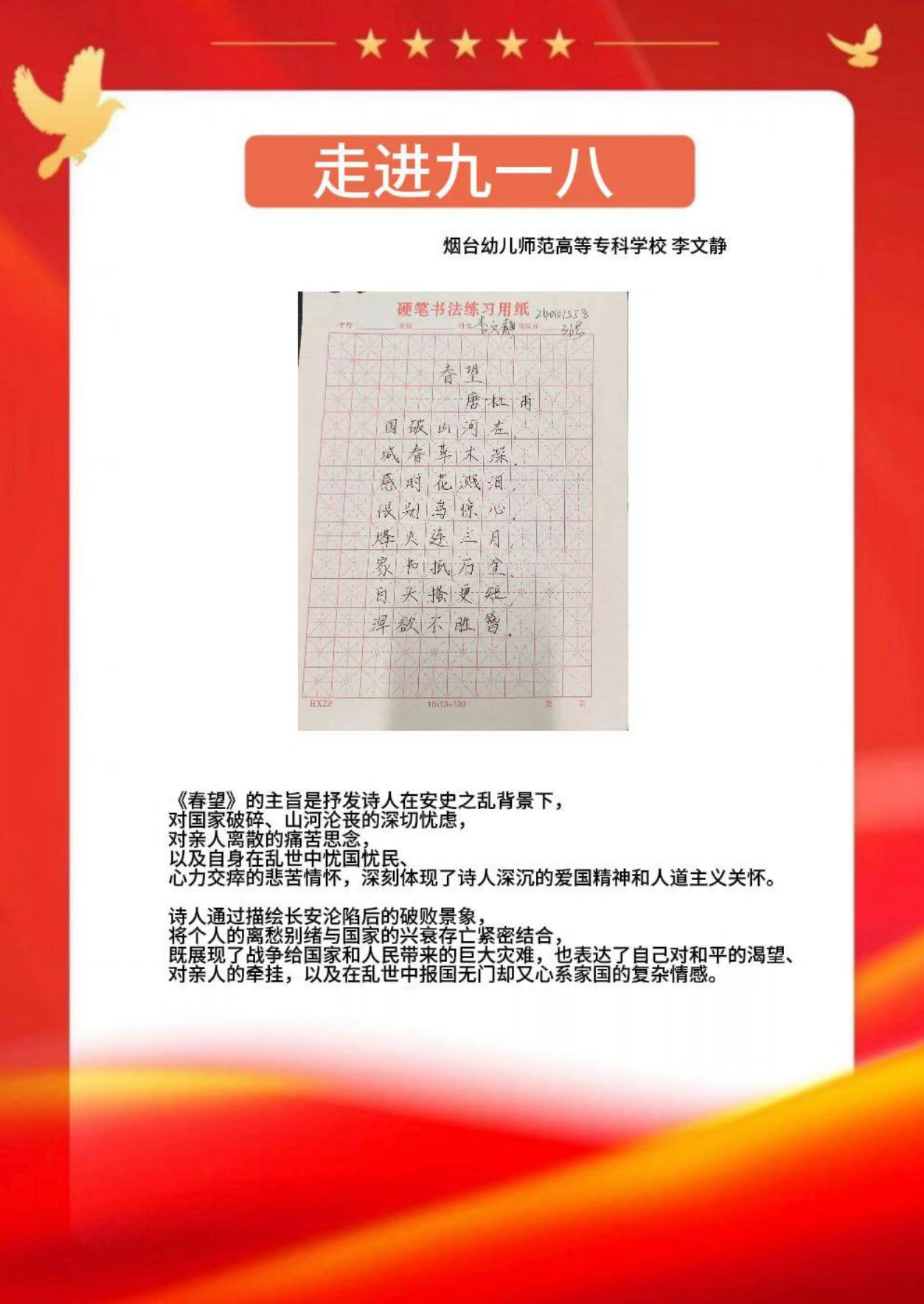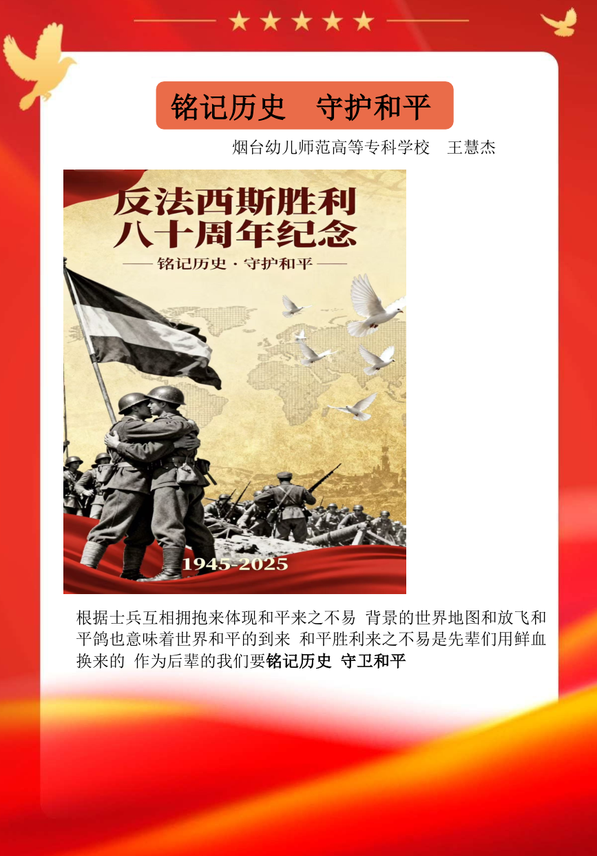 假期结束后,同学们将实践中的所见所感转化为丰富多样的创作与展示:一笔一画勾勒红色故事的手抄报,把战火纷飞的岁月与今日的盛世图景巧妙融合;声情并茂的诗歌朗诵,以铿锵语调传递对革命先辈的敬仰与对祖国的赤诚;“大学生讲思政课”活动中,学生化身主讲人,结合实践经历解读红色精神的时代价值,让思政课堂更具青春温度与感染力。这些成果既是实践感悟的凝练,更是爱国情怀的传递,让红色精神在创作与分享中代代相传,激励学生将爱国情、强国志融入日常行动。
