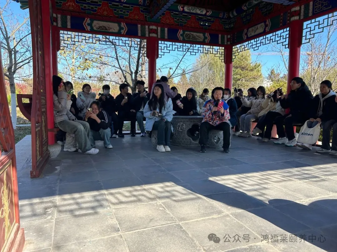 首先,鸿福莱工作人员带领大学生参观了颐养中心的园区环境、居住条件;中心依山傍水,空气清新,景观参照苏州园林格调设计,建筑精致、错落有致,有阳光连廊、禅心榭、知鱼桥、长青湖、悦亭等,每一处建筑都表达了我们对长者的美好祝福,园区绿化面积达80%以上,是莱阳范围内不可多得的生态宝地。