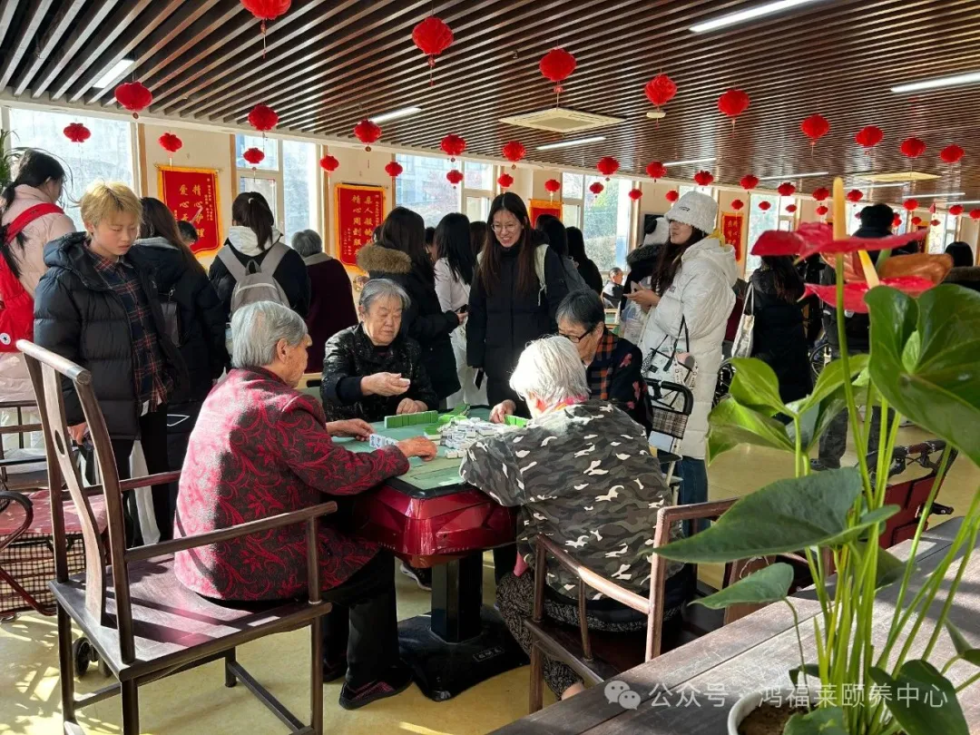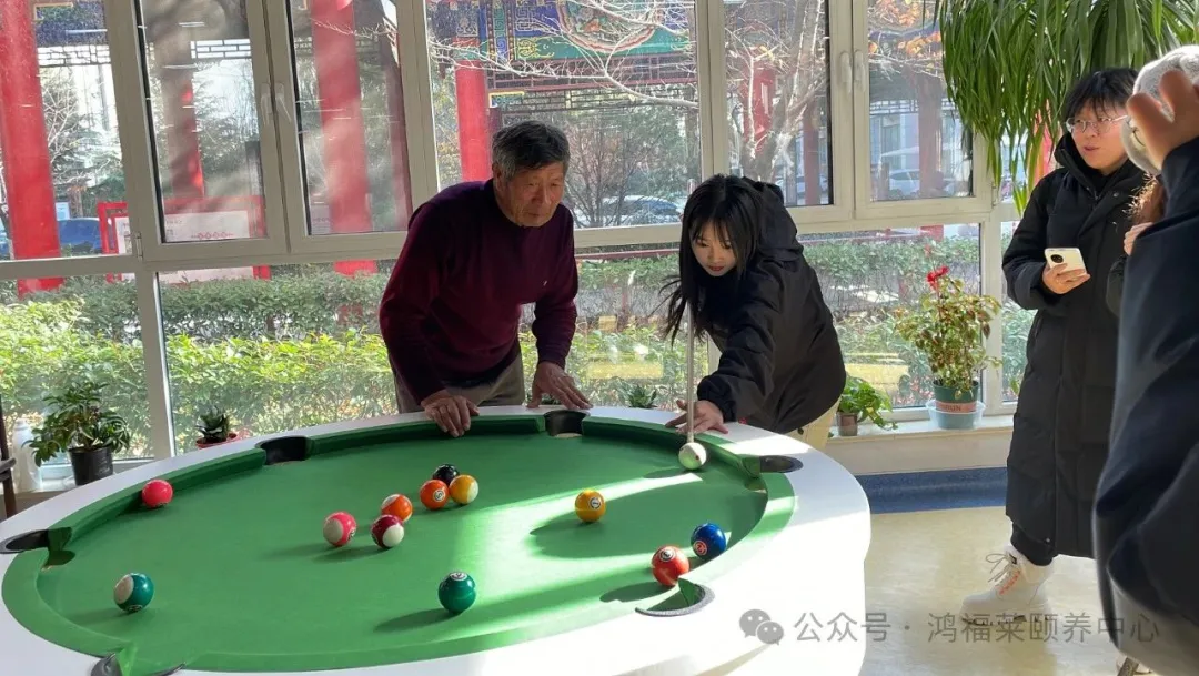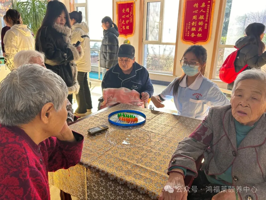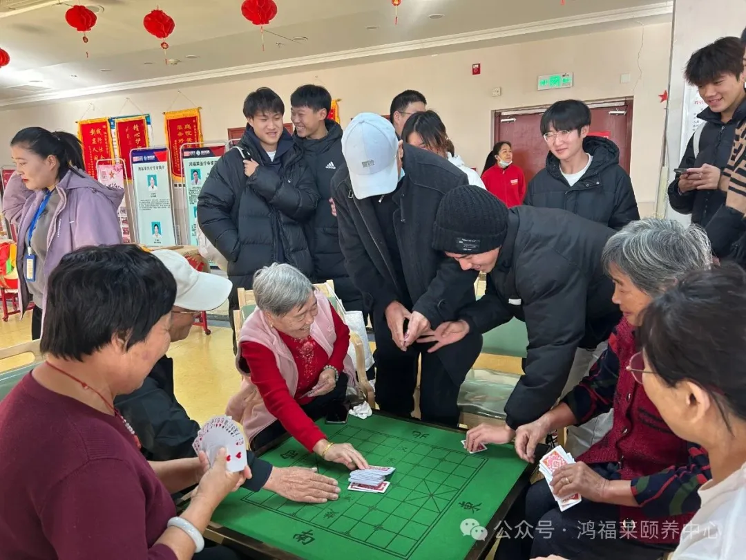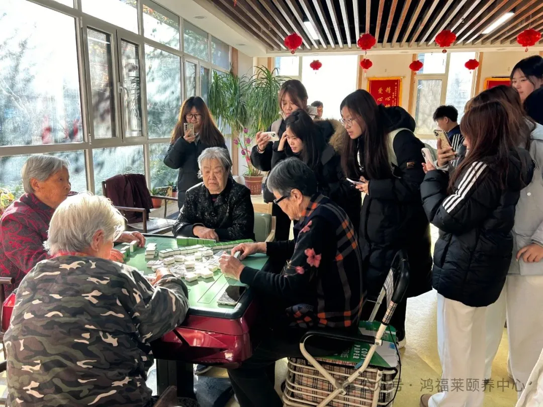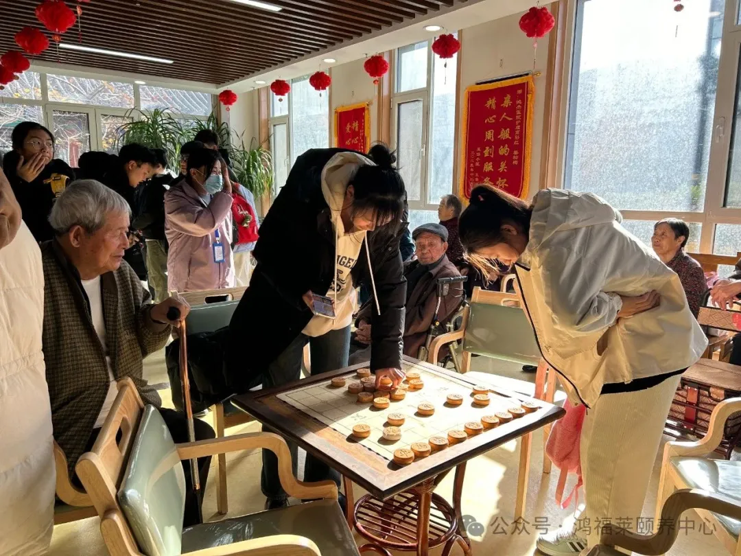 大学生积极观参与老人的娱乐活动当中,现场气氛热烈而和谐。每一张照片都定格了温暖与感动。