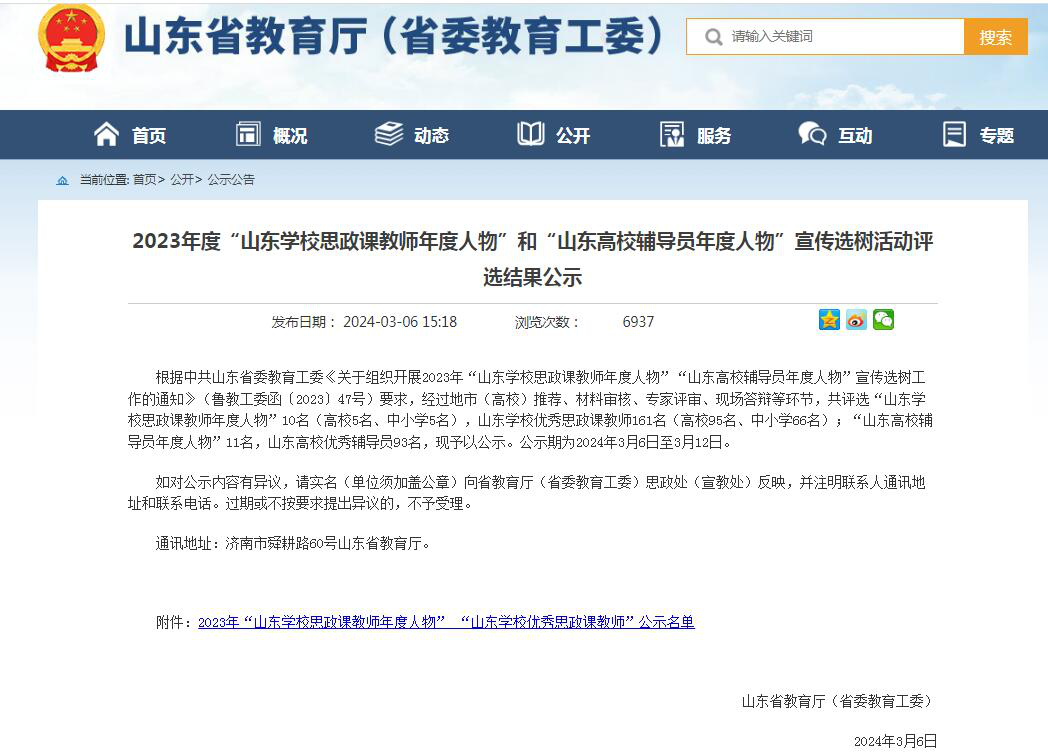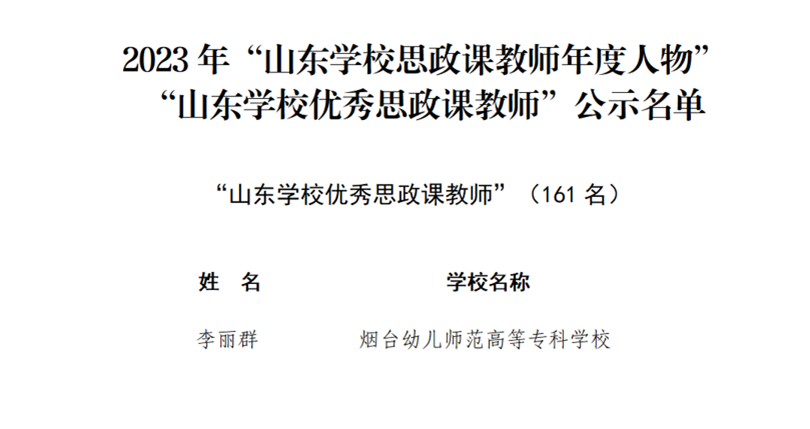 近日,中共山东省委教育工委公布了2023年度“山东学校优秀思政课教师”“山东高校辅导员年度人物”评选结果,我校马克思主义学院李丽群老师获评“山东学校优秀思政课教师”、基础教学部刘昊老师获评“山东高校优秀辅导员”。本次评选旨在大力培养选树新时代学校思想政治工作榜样,发挥先进典型的示范作用。