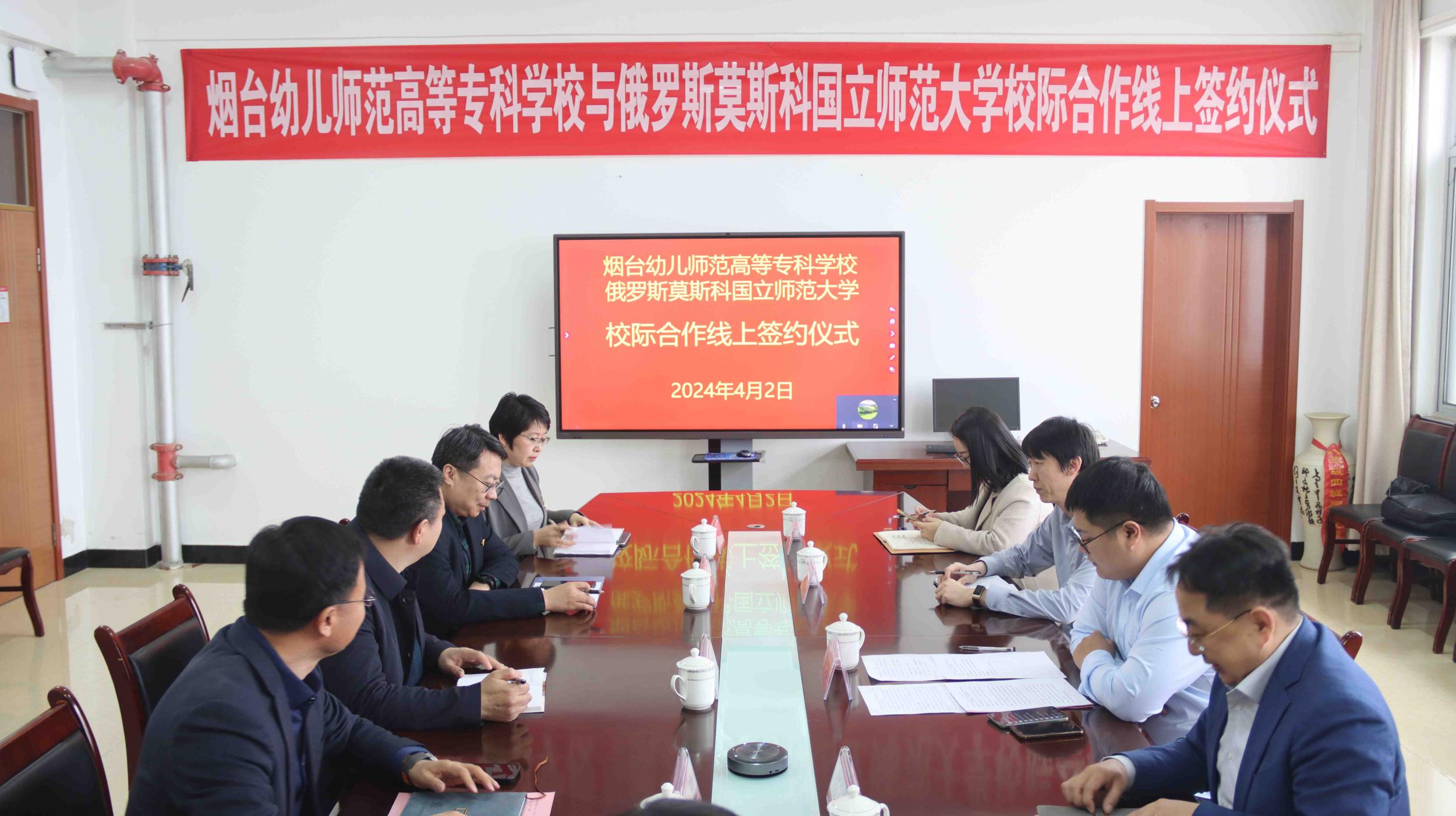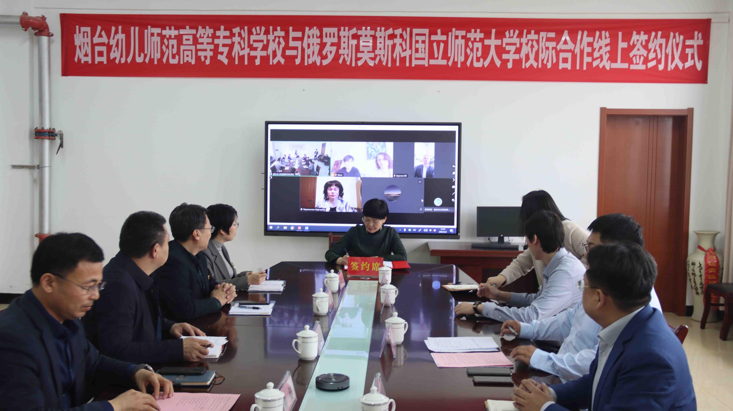 2024年4月2日下午,烟台幼儿师范高等专科学校与俄罗斯莫斯科国立师范大学视频签约仪式在学校行政办公楼416举行。学校党委副书记、校长冯开梅出席并代表学校签约,党委委员、副校长曲健主持仪式,招生与就业处、教务处等相关处室负责人参加活动。俄方副校长克鲁格洛夫,国际合作处处长马克耶娃等领导参加签约活动。此次签约标志着两校在教育领域的合作迈出了实质性的一步。