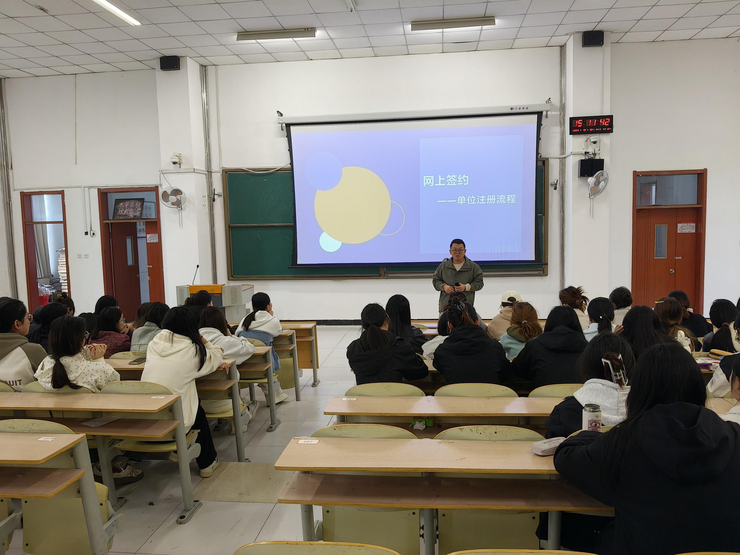 就业工作会议紧紧围绕学生实际,结合专业特点,分析就业形式,介绍了当前大学生就业的方式和类型、网签流程等内容,还就学生疑惑的其他就业问题进行了现场的耐心解答。