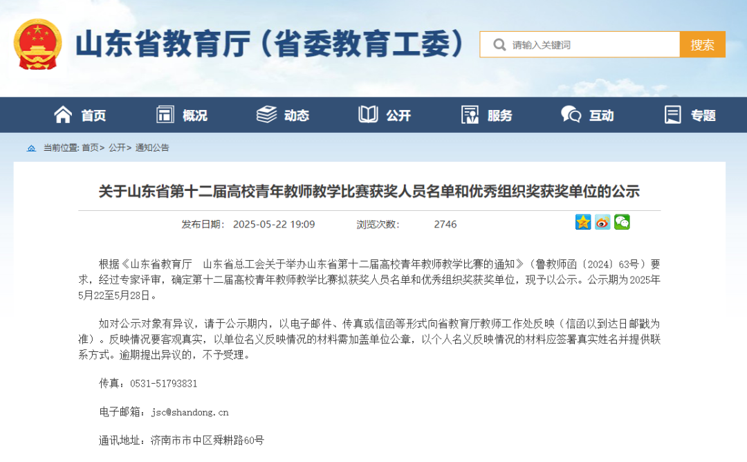 根据《山东省教育厅 山东省总工会关于举办山东省第十二届高校青年教师教学比赛的通知》要求,学校于2024年11月启动了第三届青年教师教学比赛,面向全校青年教师,历时一个月,经“院系初赛—校级复赛—校级决赛”三级竞赛机制的严格公正选拔,最终推选孟娇老师参加省赛。备赛期间,分管校领导多次组织召开专题协调会,指导备赛方案设计,教务处与艺术教育系密切配合,统筹调配教学资源,在思政融合度、前沿技术运用等环节持续优化,对课程进行反复打磨。最终,在与全省158所高校501名精英教师的同台竞技、激烈角逐中,孟娇老师表现优异,凭借其出色的学术底蕴和教学风采脱颖而出,荣获一等奖。
