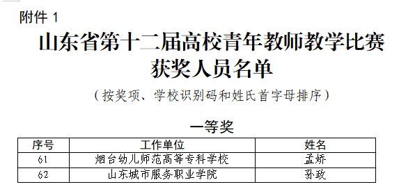 近日,山东省教育厅公布第十二届全省青年教师教学比赛结果,烟台幼儿师范高等专科学校再传捷报:艺术教育系孟娇老师凭借《中国民族民间舞》课程斩获高职组一等奖。学校连续三年均有教师获该项赛事一等奖,并首次荣膺“优秀组织奖”,此次获奖充分展现了我校青年教师培养体系的显著成效。