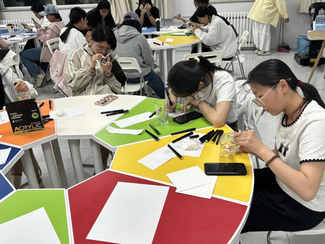 活动现场,晶莹剔透的玻璃杯化身情绪画布,同学们在自由创作中开启心灵对话。王蔚老师引导参与者:“让色彩代替言语,让图案诉说心声,每个笔触都是与自我对话的过程。”大家在轻松愉快的氛围中,用画笔在玻璃杯上描绘出自己的心灵世界。在艺术创作中完成了一次独特的心理疗愈之旅。大家在轻松愉快的氛围中,发挥自己的想象力和创造力,勇敢地表达自己的内心感受,用画笔在玻璃杯上描绘出自己的心灵世界。同学们在老师的指导下,不断地完善自己的作品,使每一个玻璃杯都成为了独一无二的艺术品。
