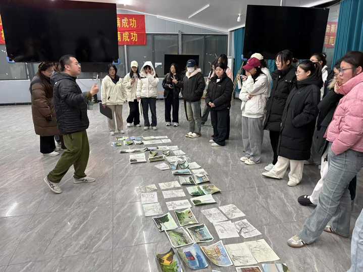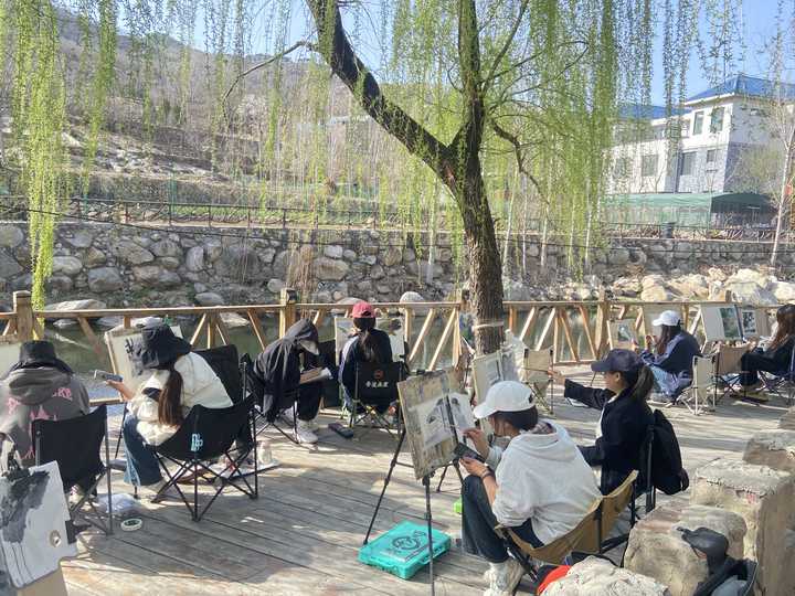清晨,师生们迅速投入到写生的训练中,同学们分散在大洼的各个角落,支起画架、摊开画纸,全神贯注地投入创作。画笔在纸上轻轻游走,将同学们眼中的春日盛景转化为色彩与线条交织的艺术作品。