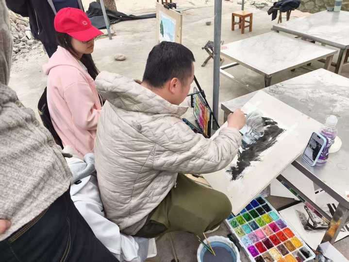 写生期间,老师们认真地指导学生们的绘画作品,同学们相互学习、互相帮助,分享自己的创作技巧,师生间互动频繁,氛围热烈。