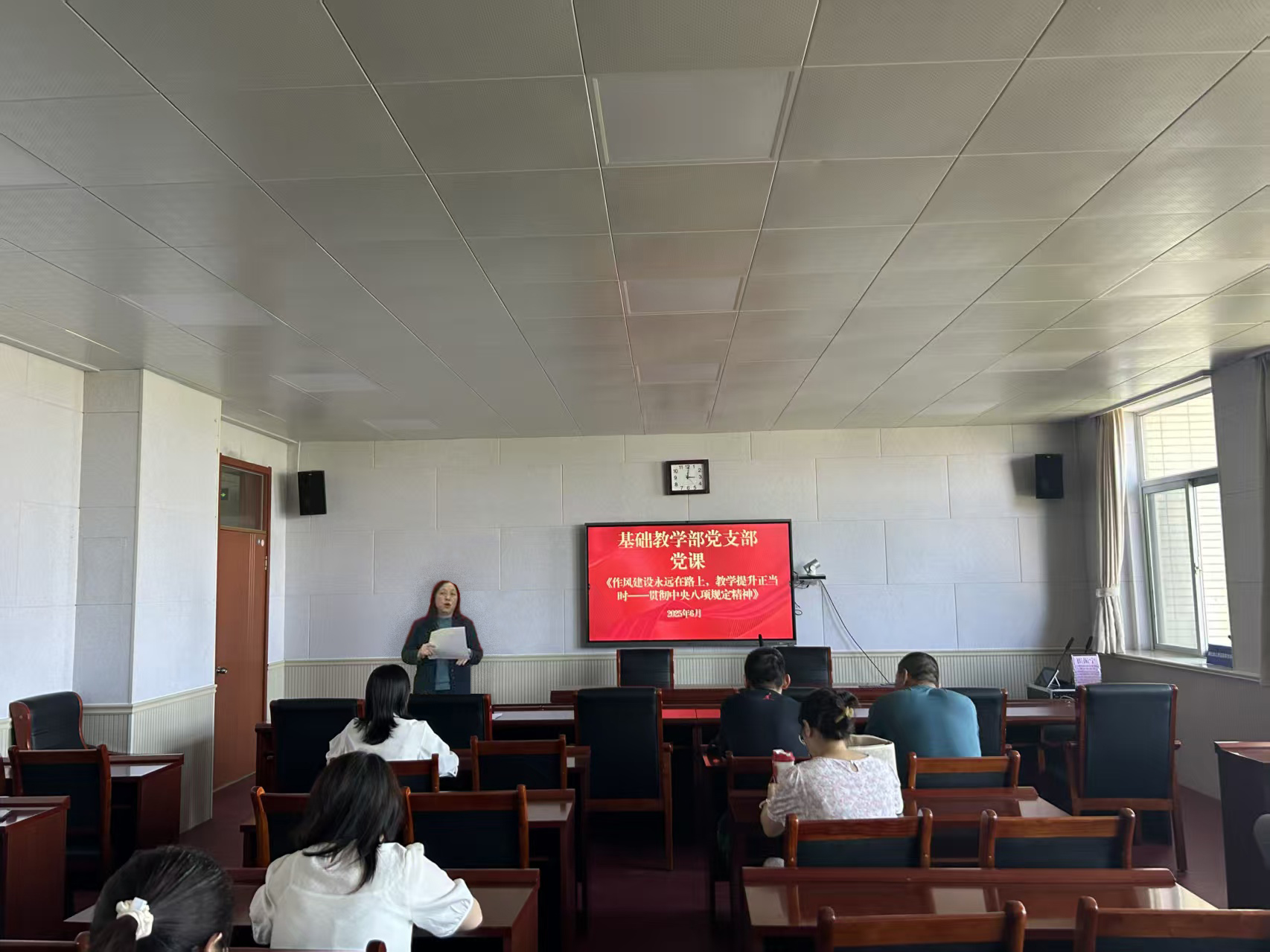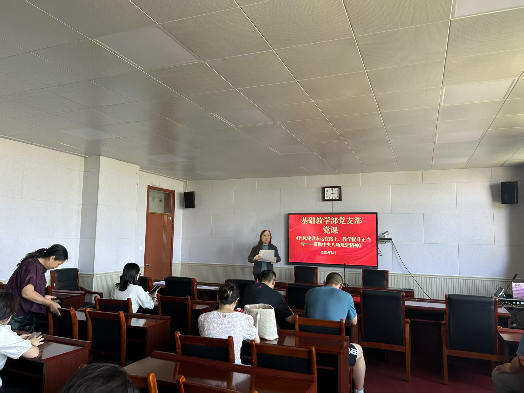 为深入贯彻中央八项规定精神,推动作风建设与教学实践深度融合,2025年6月,基础教学部党支部在办公楼402会议室组织全体党员开展专题党课学习。本次党课由支部书记张桂华同志主讲,围绕"作风建设永远在路上,教学提升正当时"这一主题展开深入研讨。