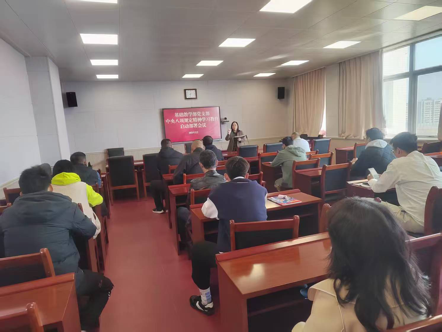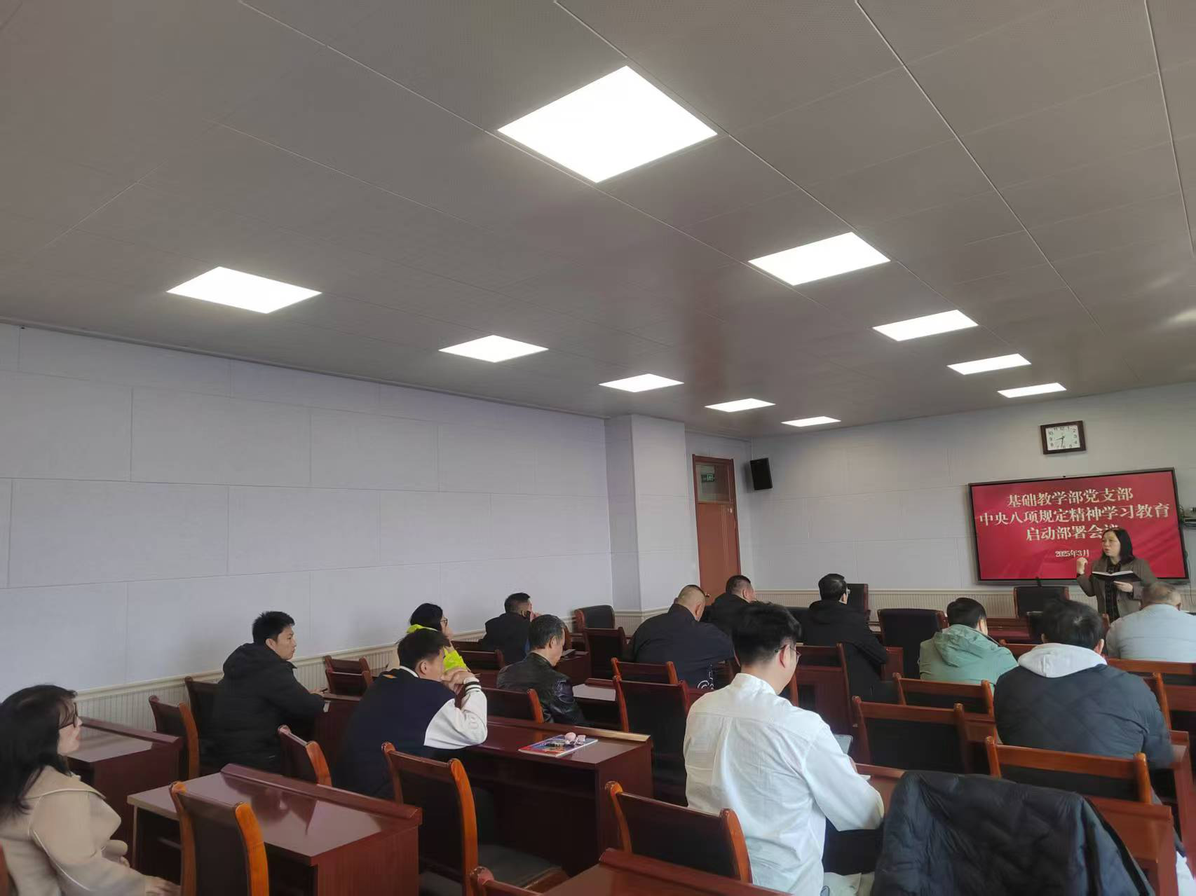 2025年3月,基础教学部党支部根据学校党委组织部统一要求,召开了本党支部深入贯彻中央八项规定精神学习教育动员部署会。会上,张桂华同志传达中央党的建设工作领导小组会议精神和中共中央办公厅印发的《关于在全党开展深入贯彻中央八项规定精神学习教育的通知》。