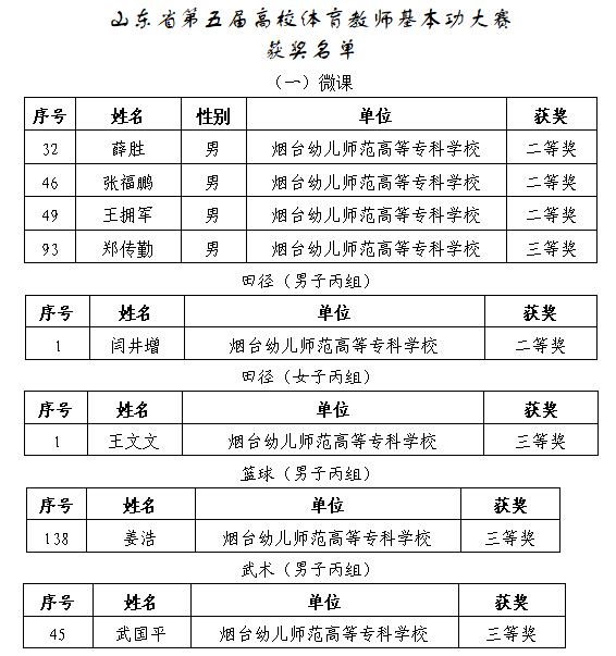 近日,山东省教育厅正式公布《山东省第五届高校体育教师基本功大赛获奖名单》。我校体育教师团队凭借扎实深厚的专业素养与出色的课堂教学能力,在这场激烈的竞技中脱颖而出,一举斩获8项殊荣,为学校荣誉簿再添浓墨重彩的一笔。