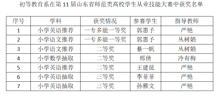 近日,由省教育厅主办的第11届山东省师范类高校学生从业技能大赛决赛结果公布。全省50所师范类高校的780名选手参加决赛,经过激烈角逐,我系6名学生在省赛决赛中荣获一等奖1人、二等奖3人、三等奖2人。具体获奖名单如下:
