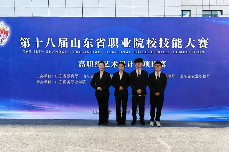 近日,第十八届山东省职业院校技能大赛高职组艺术设计赛道比赛在山东商务职业学院举行,来自全省的58支代表队参加了此次比赛。我系选派马心缘、张晓帅、曹圣、刘梦如四位同学组队参赛,在胡安鹏、李婧两位教师的指导下,团队凭借扎实的专业能力和稳定的现场发挥,荣获铜奖。