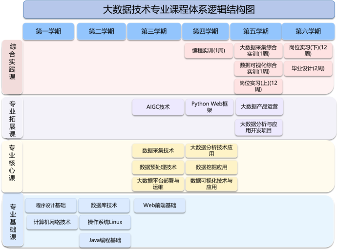 高职大数据技术专业课程体系按照专业基础课、专业核心课、专业拓展课、综合实践课程四个模块设置,各课程模块有机融合、层层递进,实现知识传授、能力培养和素养提升的统一。