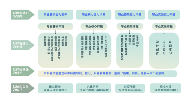 培养具有良好的职业道德和艺术文化素质,思想政治坚定、全面发展,适应动漫、游戏及数字艺术相关行业发展需要,具有扎实的动漫设计理论基础、较强的动漫设计、游戏制作能力以及良好的团队合作意识,掌握前沿数字化制作技术,胜任各类动漫制作公司、游戏制作公司、动漫衍生行业、数字艺术行业需求的复合型、创新型高素质技术技能人才。