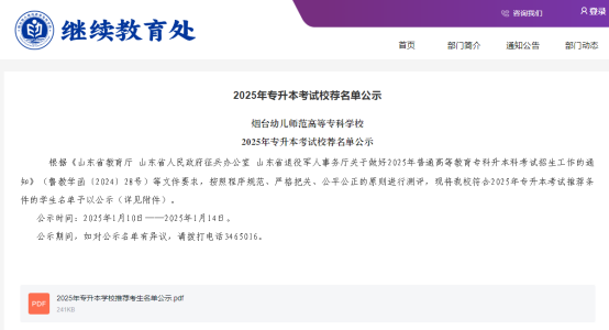 经过审核将初步确定的2025年我校校荐考生名单799人,建档立卡考生名单8人,于2025年1月10日—14日发布在我校官网进行为期五天的公示。设立专门举报电话和邮箱,及时处理反馈信息。公示期间,未收到任何异议。公示无异议后,按照上级要求,整理校荐生名单、建档立卡考生名单上传到山东省普通高等教育专科升本科考试管理平台。