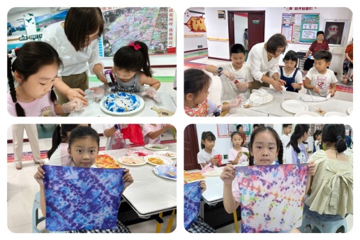 学前教育一系王淼带领孩子们进入了扎染的世界。孩子们通过实践,感受扎染的魅力,在活动中进行探索体验,发现扎结与染色之间产生的晕染变换,从中感悟不同的扎结方法与所呈现的图案之间的规律。