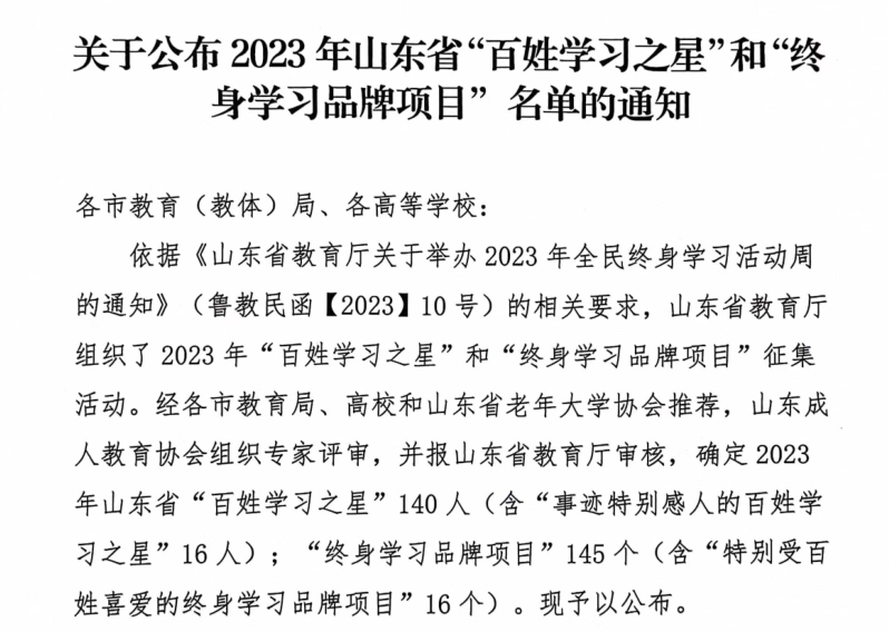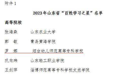 近日,山东省教育厅组织开展的2023年度山东省“百姓学习之星”和“终身学习品牌项目”评选结果揭晓。学校罗娜老师入选2023年度山东省“百姓学习之星”,“烟台幼儿师范高等专科学校社区教育大讲堂”项目入选山东省2023年“终身学习品牌项目”。