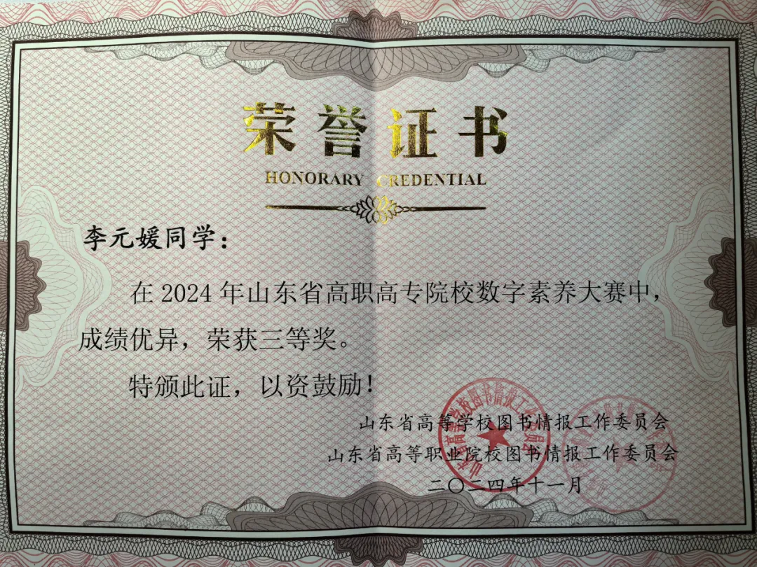 2024年10月26日,山东省高职高专院校数字素养大赛已经圆满落幕。全省共计50所高职高专院校参与,参赛人数达22570人。我校李元媛同学脱颖而出,荣获三等奖。