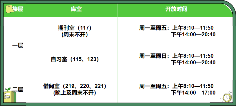 注:根据季节变化,开放时间可能会做出相应的调整,请同学们及时关注公众号消息。另外,法定节假日开放时间也请关注图书馆微信公众号消息。