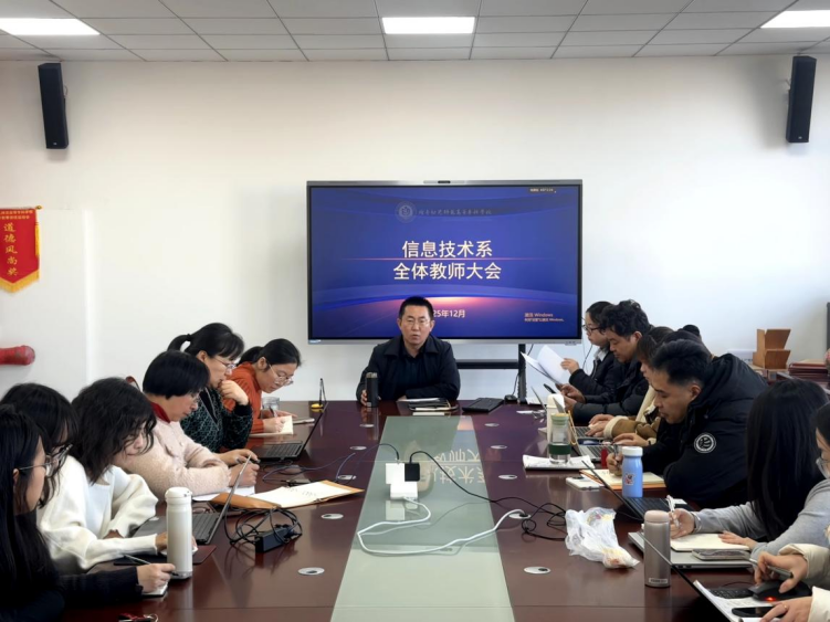 为全面总结本学期教学工作成效,系统部署期末阶段各项任务,科学谋划新学期重点发展方向,12月24日下午,信息技术系在F楼202会议室召开全体教师大会。王伟星主持会议,全系教师参加。会议围绕期末考务安排、教学收尾工作以及2026年重点任务展开。宫云凤在会议中强调,要严格规范期末命题、监考及成绩录入等环节,确保教学工作闭环严谨、有序衔接。