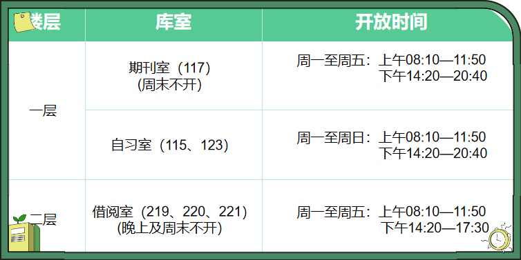注:根据季节变化,开放时间可能会做出相应的调整,请同学们及时关注公众号消息。另外,法定节假日开放时间也请关注公众号消息。