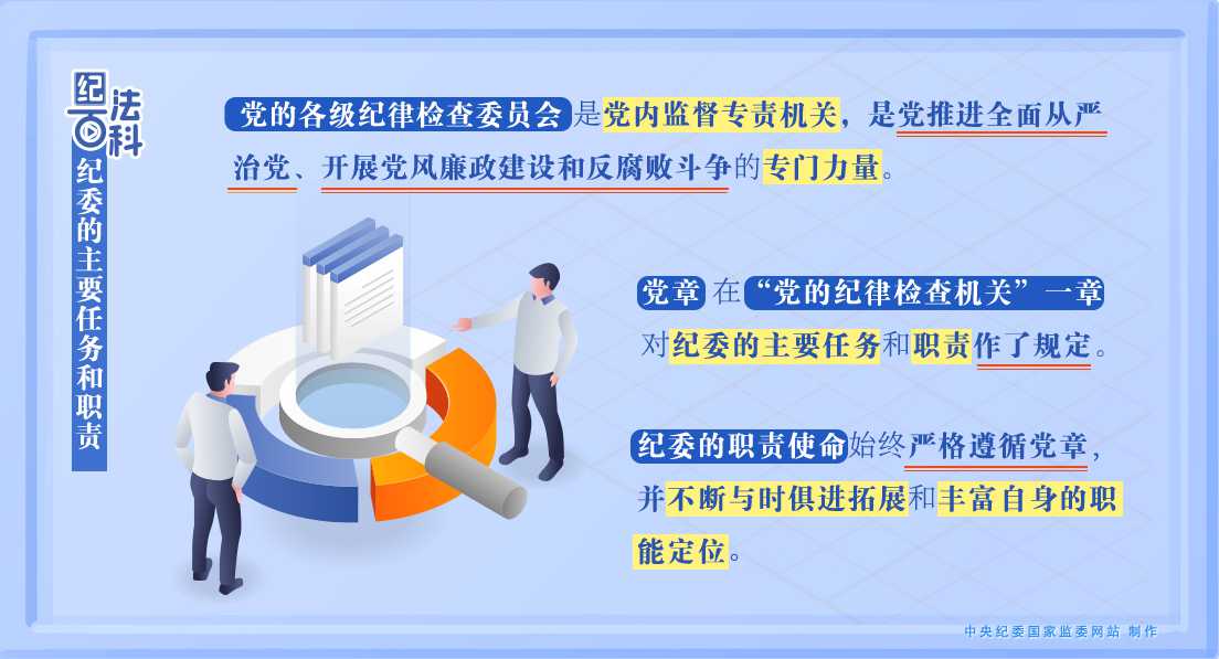 2021年,中共中央发布《中国共产党纪律检查委员会工作条例》,《条例》第三条规定,党的各级纪律检查委员会的主要任务是:维护党的章程和其他党内法规,检查党的理论和路线方针政策、党中央决策部署执行情况,协助党的委员会推进全面从严治党、加强党风建设和组织协调反腐败工作。《条例》第四章、第五章分别以专章的形式对党的各级纪律检查委员会的主要任务、工作职责作出具体规范。