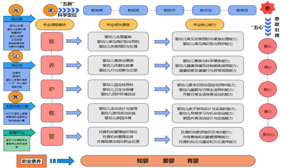 专业紧密对接托育行业新政策、新标准、新技术、新方法和行业发展新规划,构建“岗课赛证融通”模块化课程体系,形成“岗位引领、课程支撑、竞赛提升、证书赋能”的人才培养闭环机制。以“爱心、细心、耐心、恒心、责任心”五心思政为价值引领,构建“医、养、护、教、管”五大模块课程体系,实现知识结构与岗位能力精准匹配。
