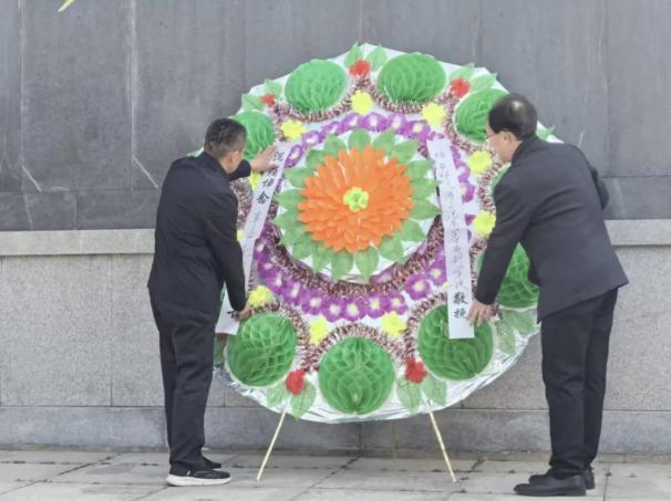 在英雄纪念碑前,高涛、栾利涛同志代表全体人员向英雄纪念碑敬献花圈并仔细整理挽联。在庄严肃穆的氛围中,全体人员肃立默哀3分钟,以最真挚的情感寄托对烈士的哀思与敬意。全体党员面向鲜红的党旗,高举右拳重温入党誓词,铮铮誓言响彻陵园,彰显着新时代教育工作者传承红色基因的坚定决心。随后,全体人员依次向烈士墓三鞠躬,并缓步绕行瞻仰英雄纪念碑,表达对革命先辈的无限崇敬。