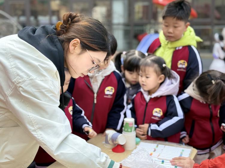 实验环节中,师范生引导孩子们将彩色颜料滴入清水中,观察颜料晕染扩散的奇妙现象,以直观的方式为孩子们科普分子运动的简单原理,让孩子们在视觉体验中感受科学的神奇。