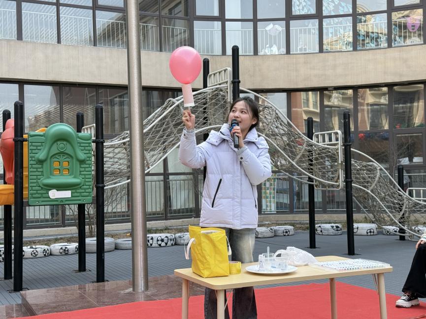 舞台上,彩色气球化身“小火箭”腾空而起,师范生们借此向孩子们讲解反冲力的科学原理——气球内气体喷出产生反作用力,推动气球上升,生动还原了火箭升空的简易原理,充分点燃了孩子们的探索好奇心。